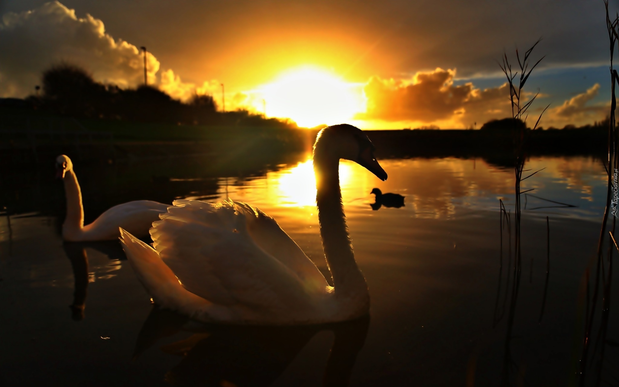Edytor tapety: Łabędzie, Para, Młode, Jezioro, Zachód Słońca