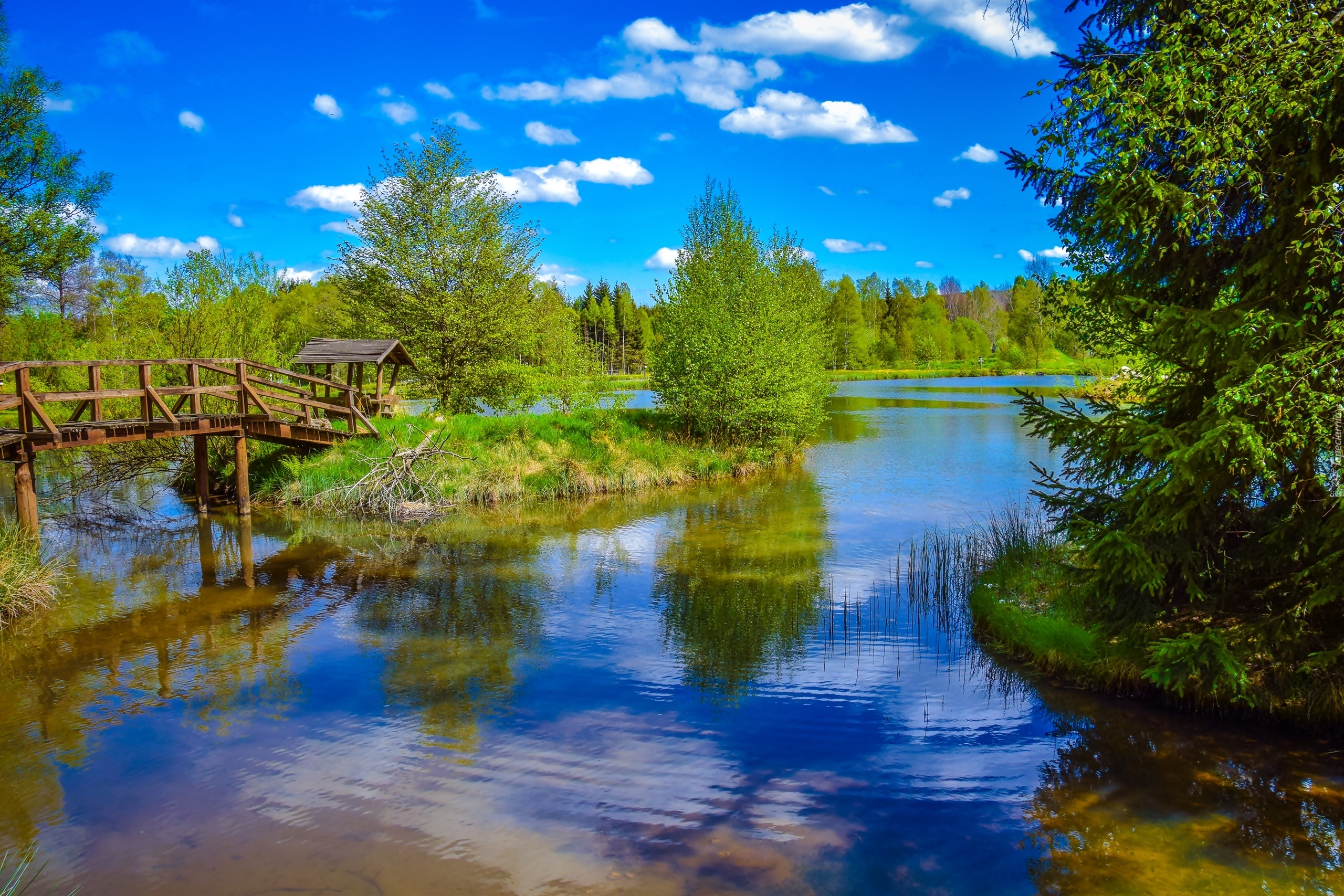 Edytor tapety: Mostek, Jezioro, Las