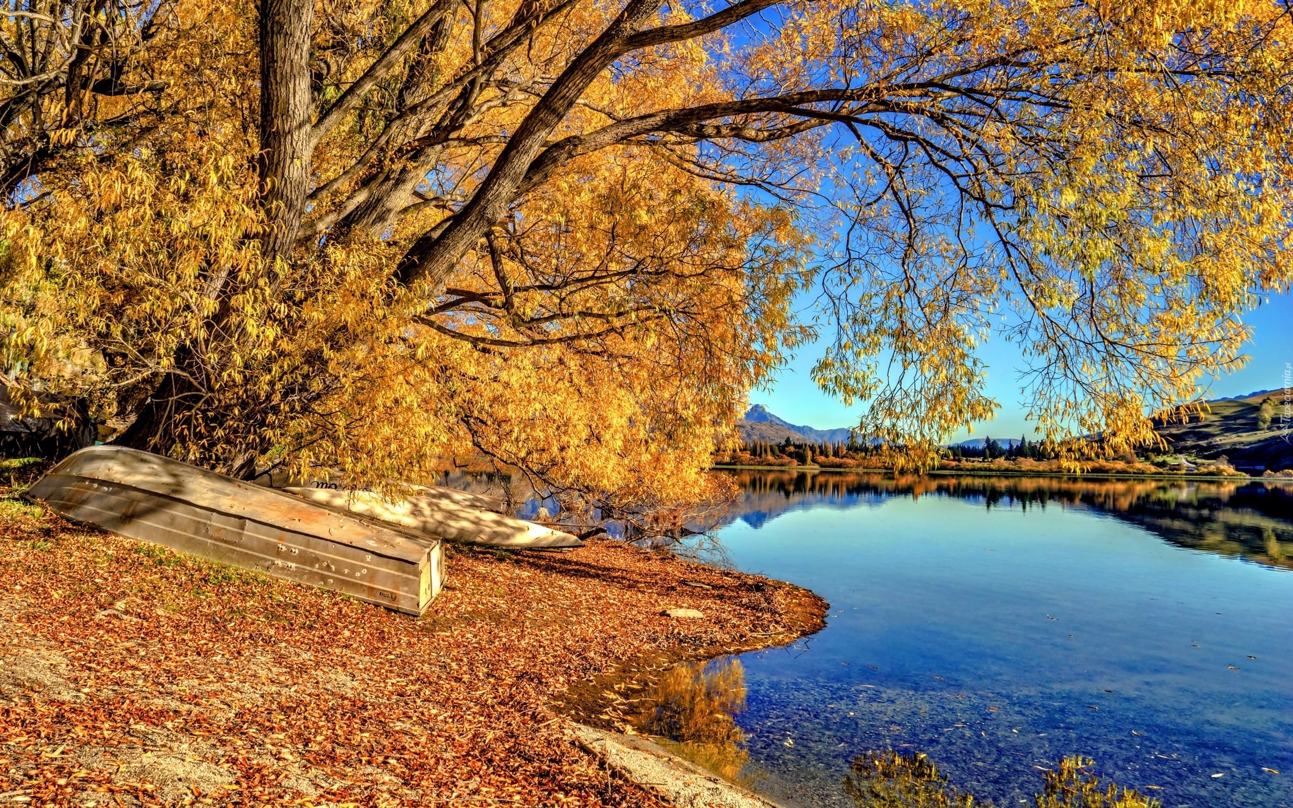 Edytor tapety: Jezioro, Hayes, Góry, Lasy, Łódki, Jesień, Nowa, Zelandia