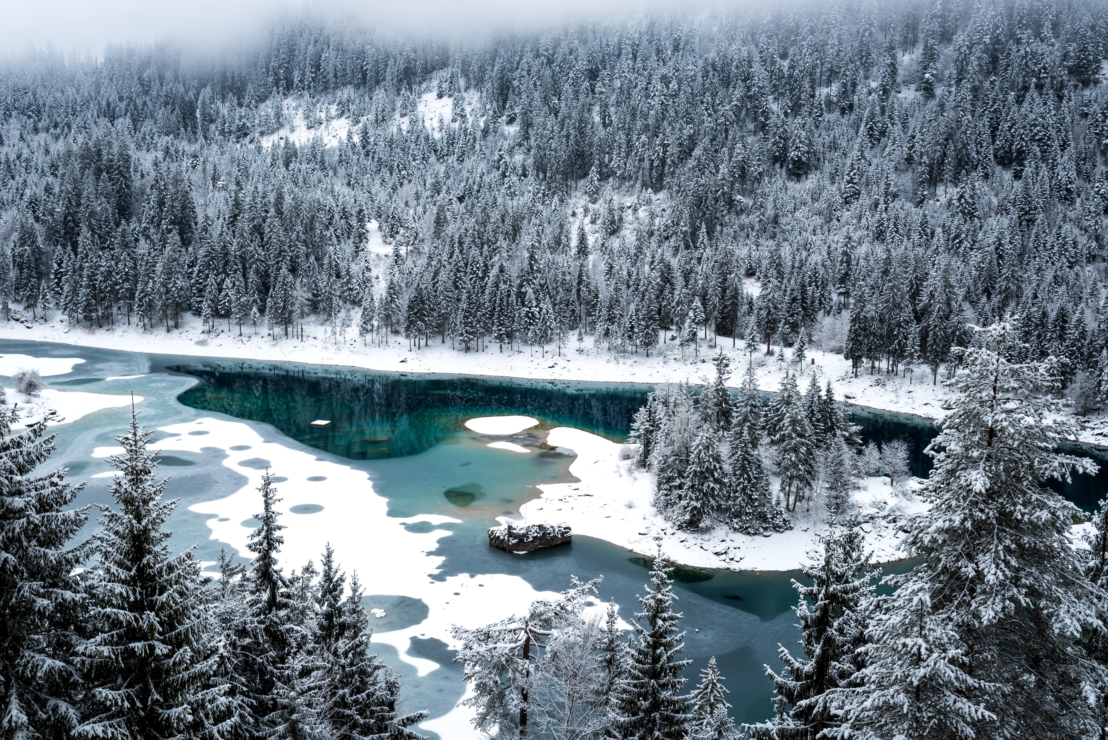 Edytor tapety: Zima, Rzeka, Ośnieżone, Świerki