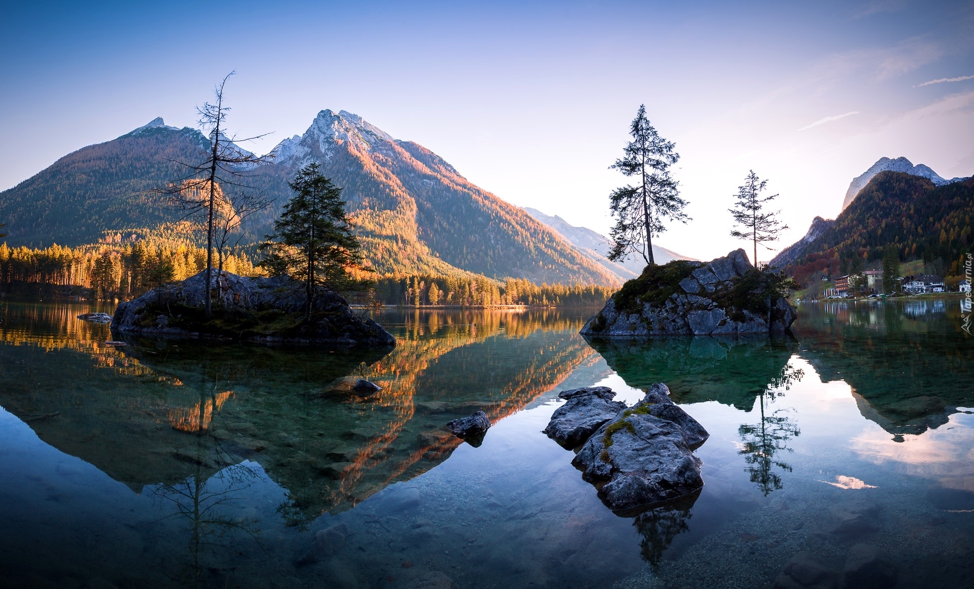 Edytor tapety: Jezioro, Góry, Skały, Drzewa, Odbicie