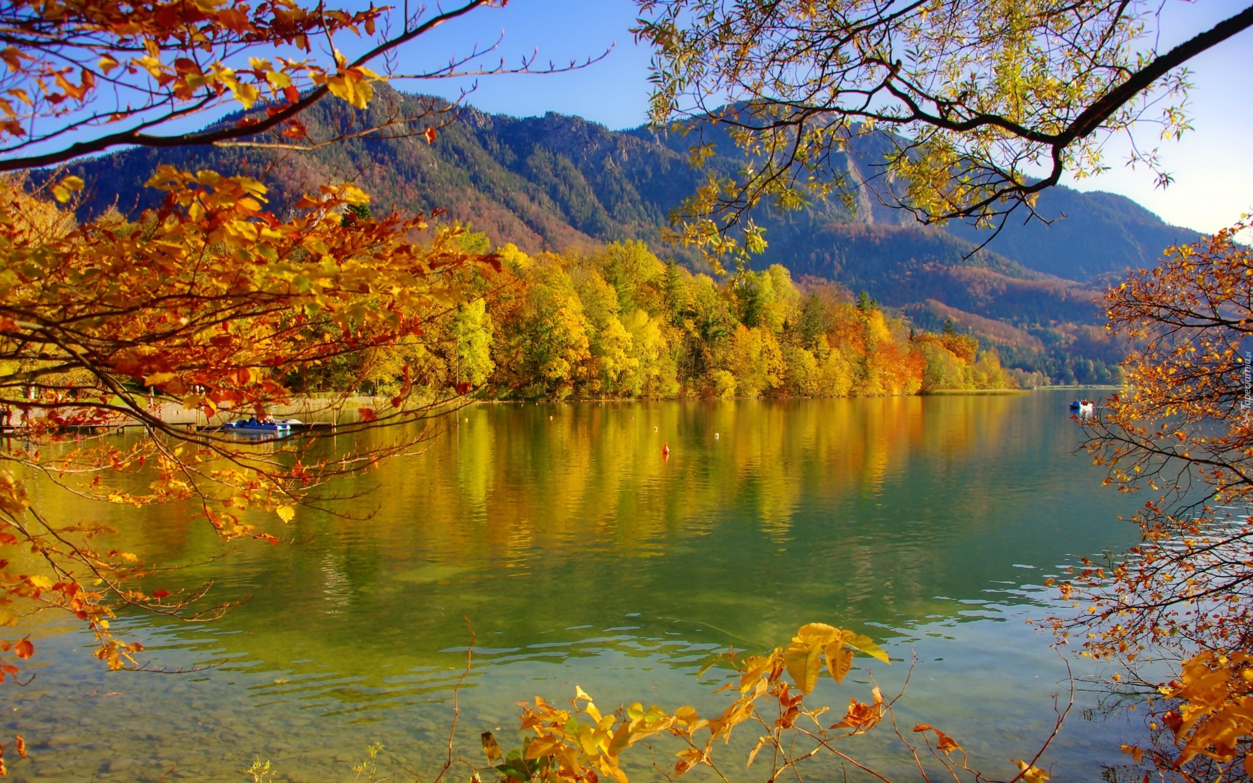 Edytor tapety: Jezioro, Góry, Lasy, Drzewa, Łódki, Jesień