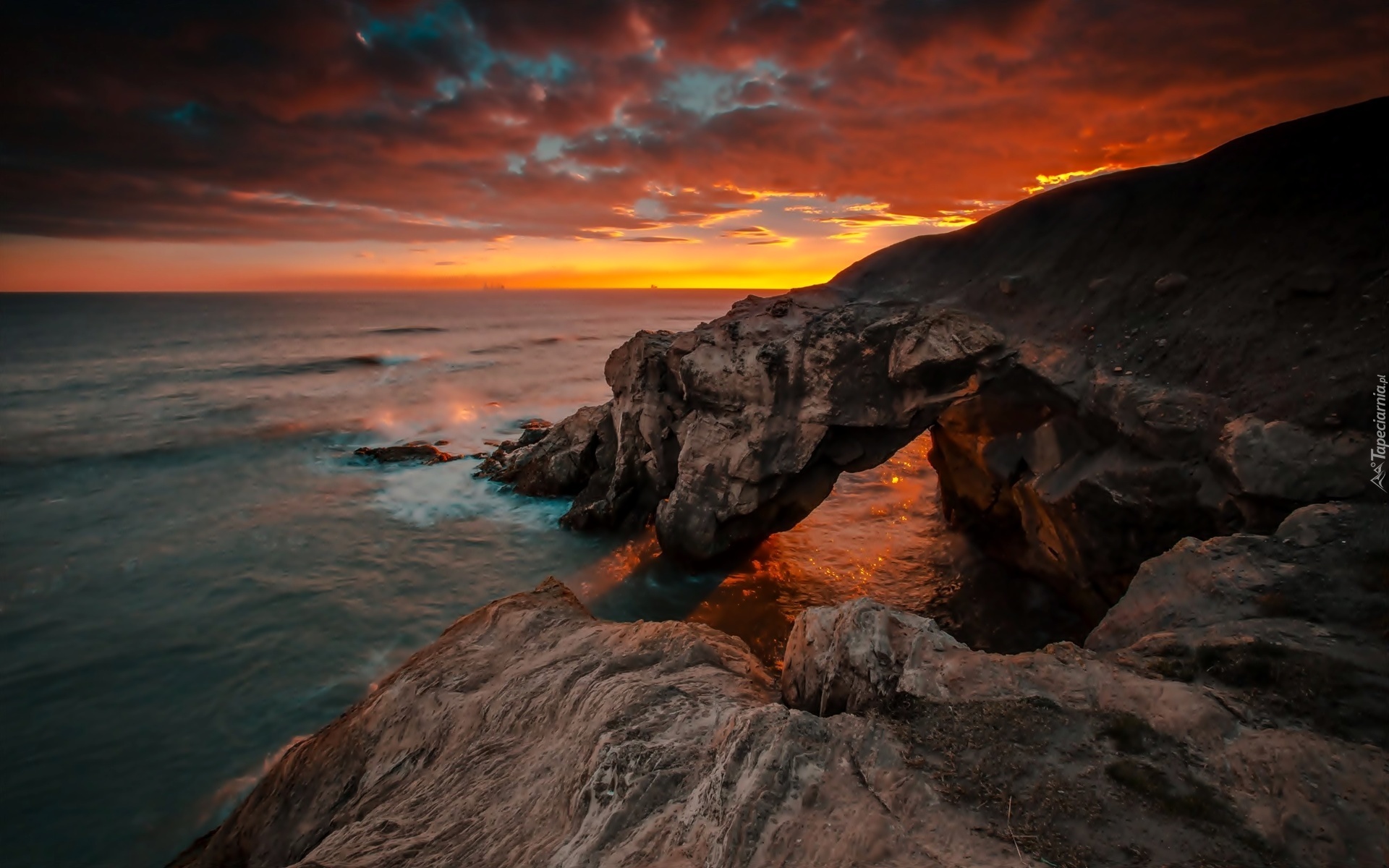 Edytor tapety: Wschód Słońca, Morze, Wybrzeże, Skały