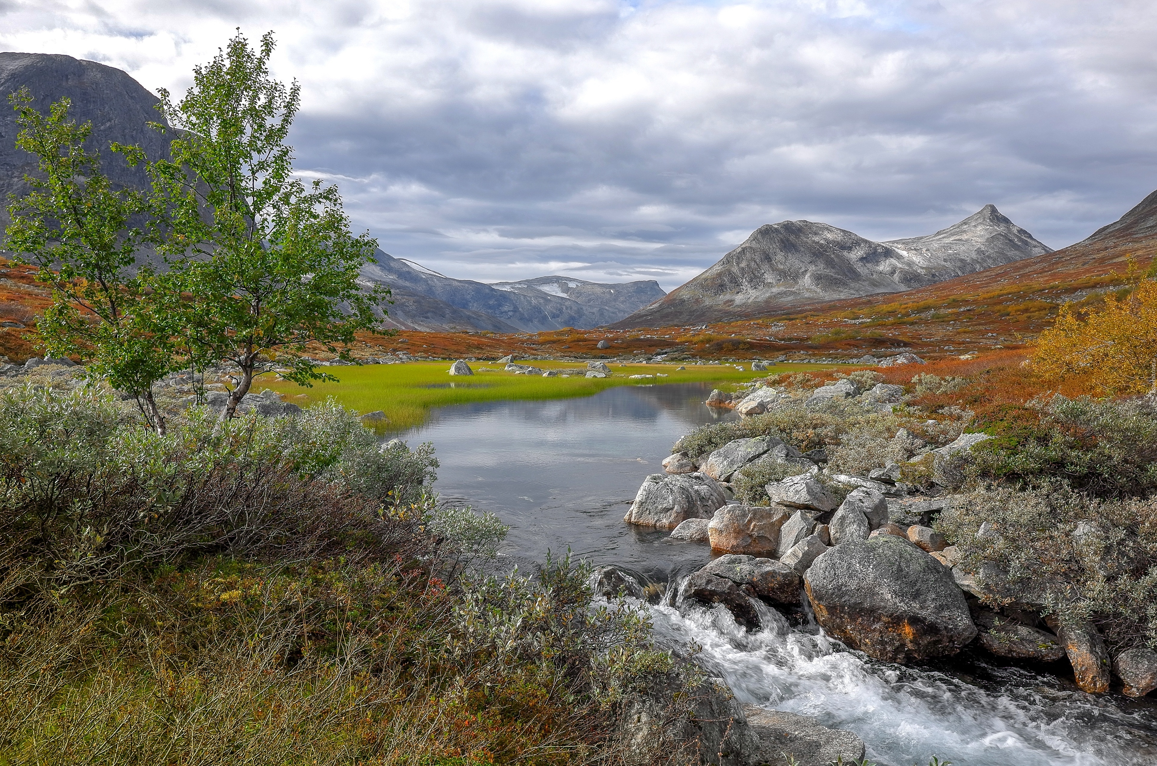 Edytor tapety: Norwegia, Rezerwat przyrody Vermedalen, Wzgórza, Kamienie, Rzeczka, Drzewo, Góry