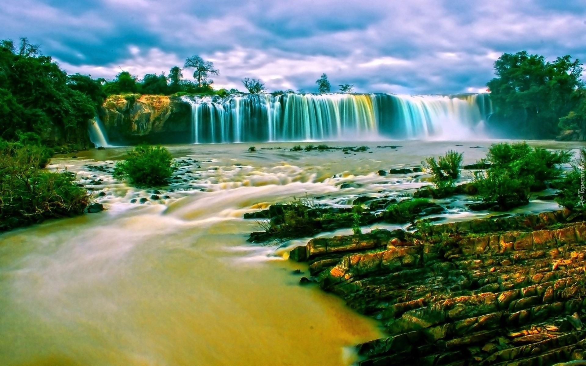 Edytor tapety: Zielony, Wodospad, Drzewa, Krzewy, Kamienie