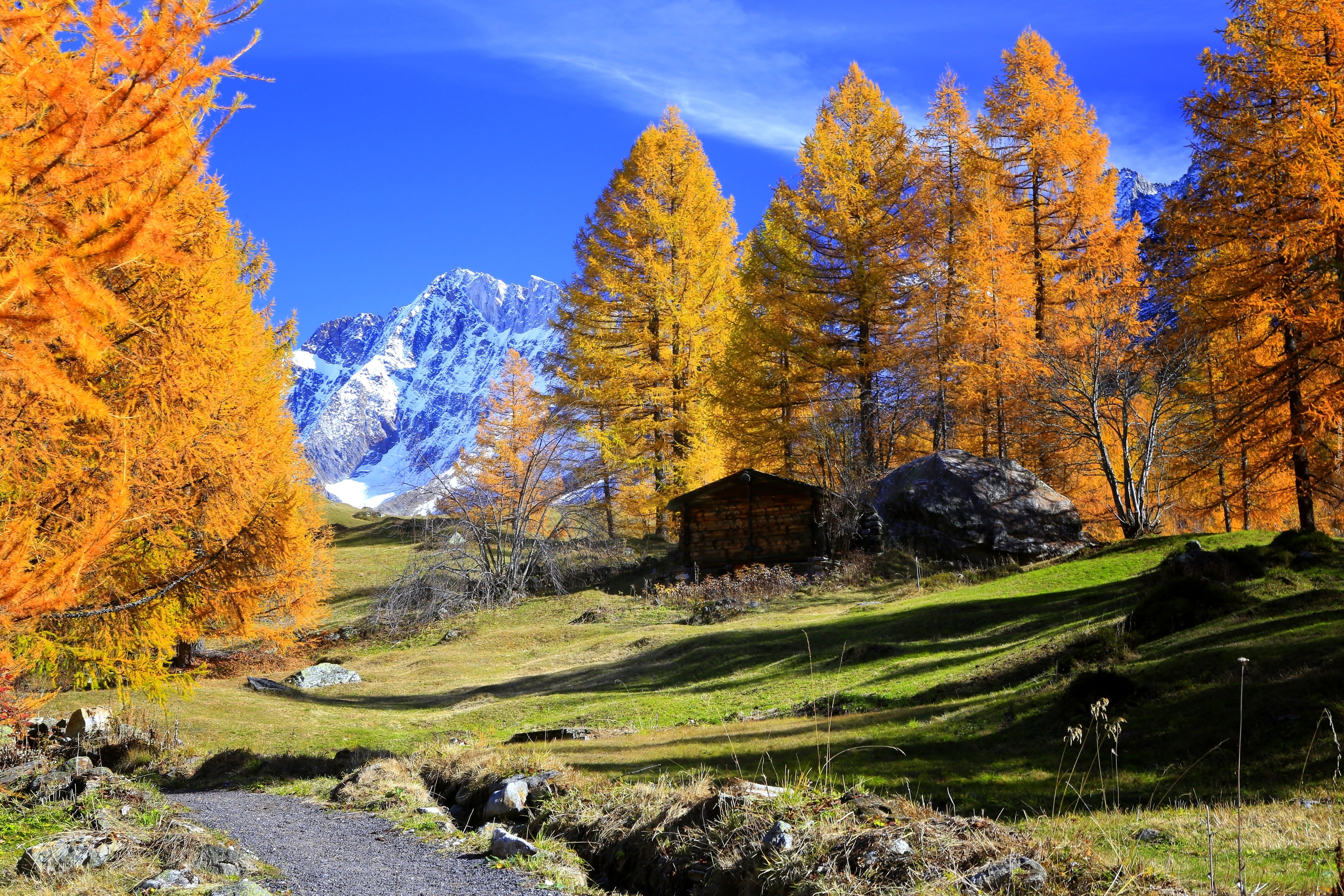 Edytor tapety: Jesień, Drzewa, Góry, Wzgórza, Domek, Kamienie,Droga