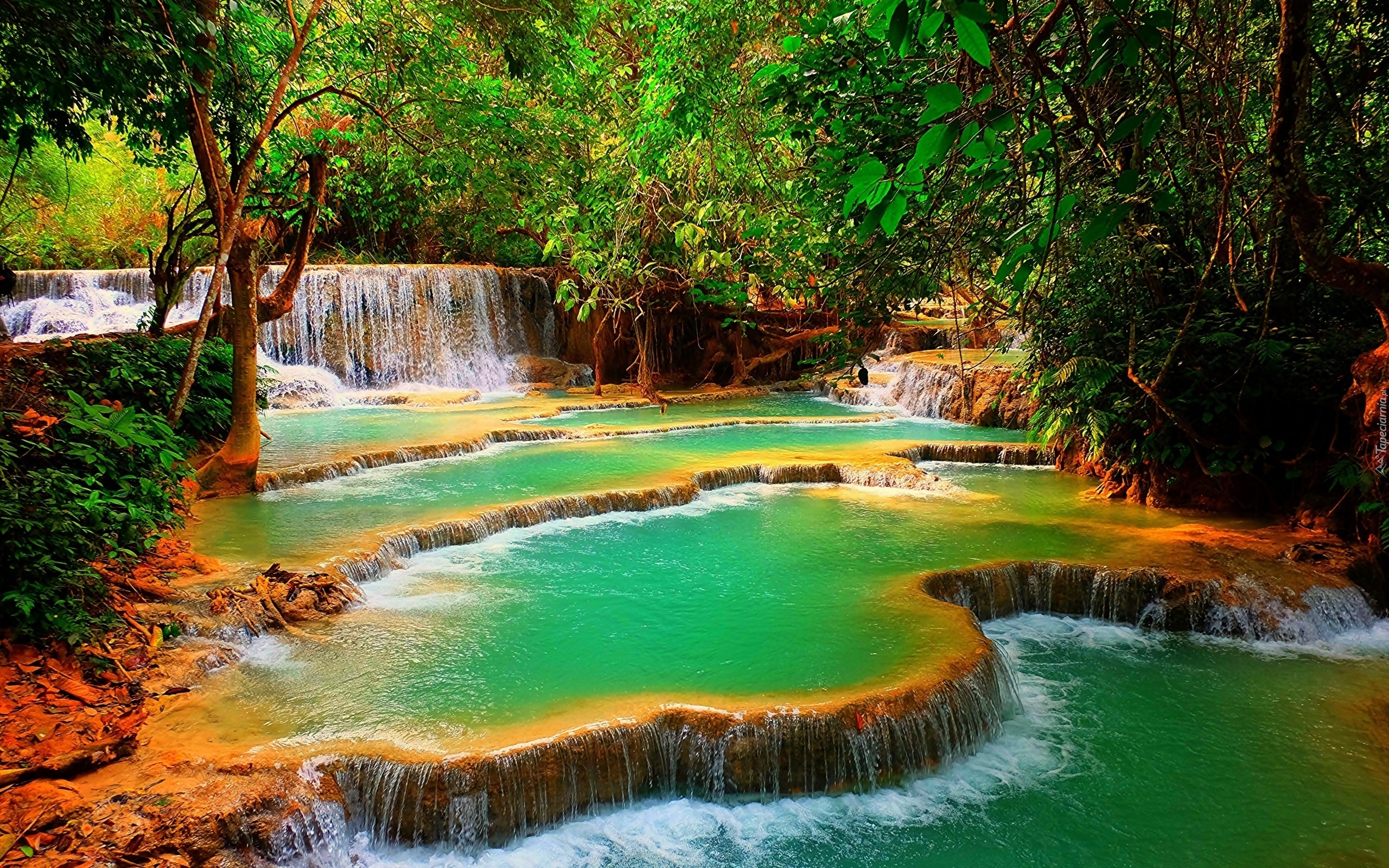 Edytor tapety: Wodospad, Kuang Si, Drzewa, Las, Laos