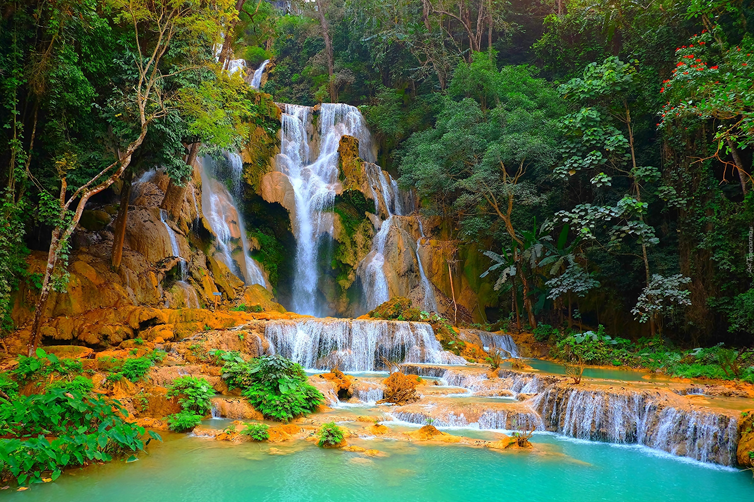 Edytor tapety: Las, Jeziorko, Wodospad, Kuang Si, Laos
