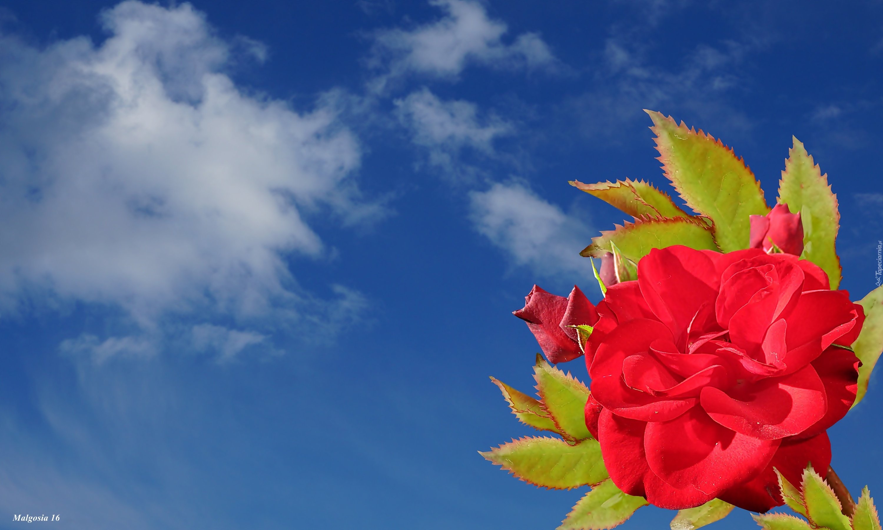 Edytor tapety: Niebo, Czerwona, Róża, Pąki, Liście