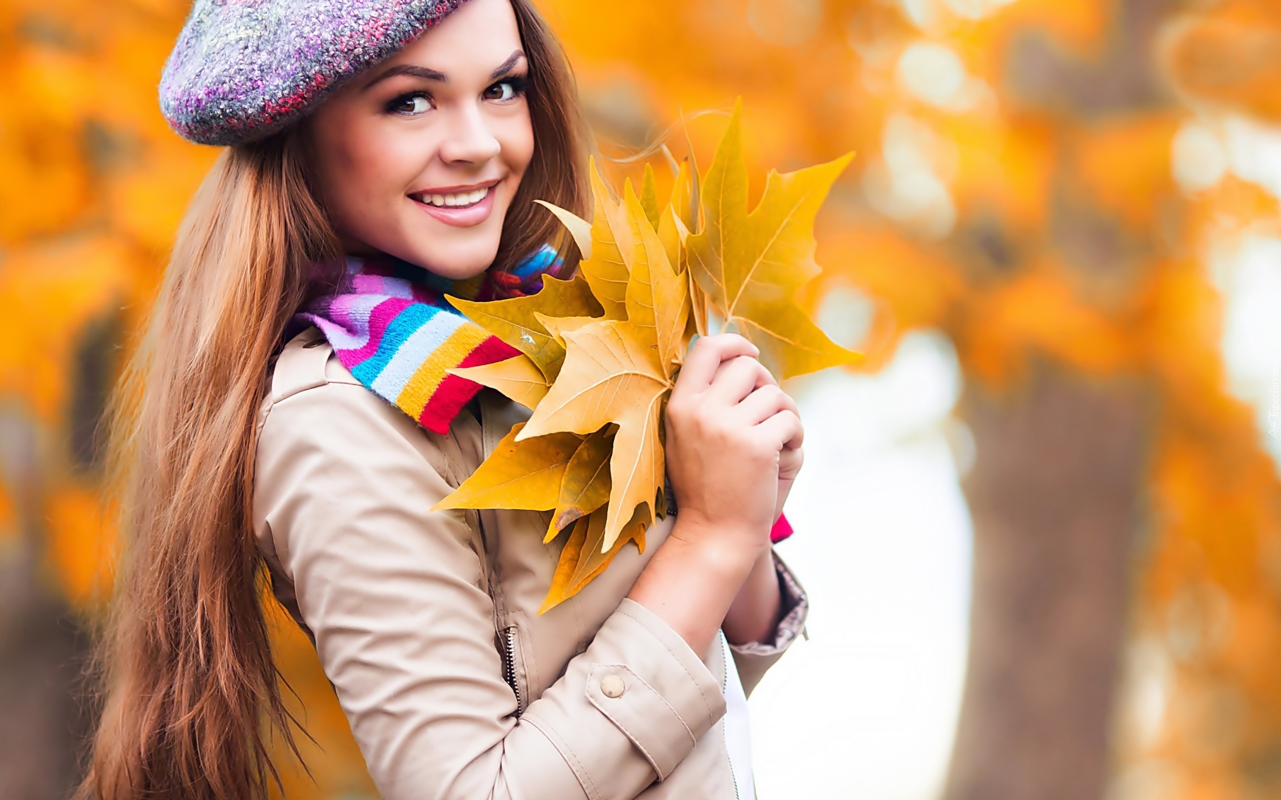 Edytor tapety: Uśmiechnięta, Dziewczyna, Bukiecik, Jesiennych, Liści, Park