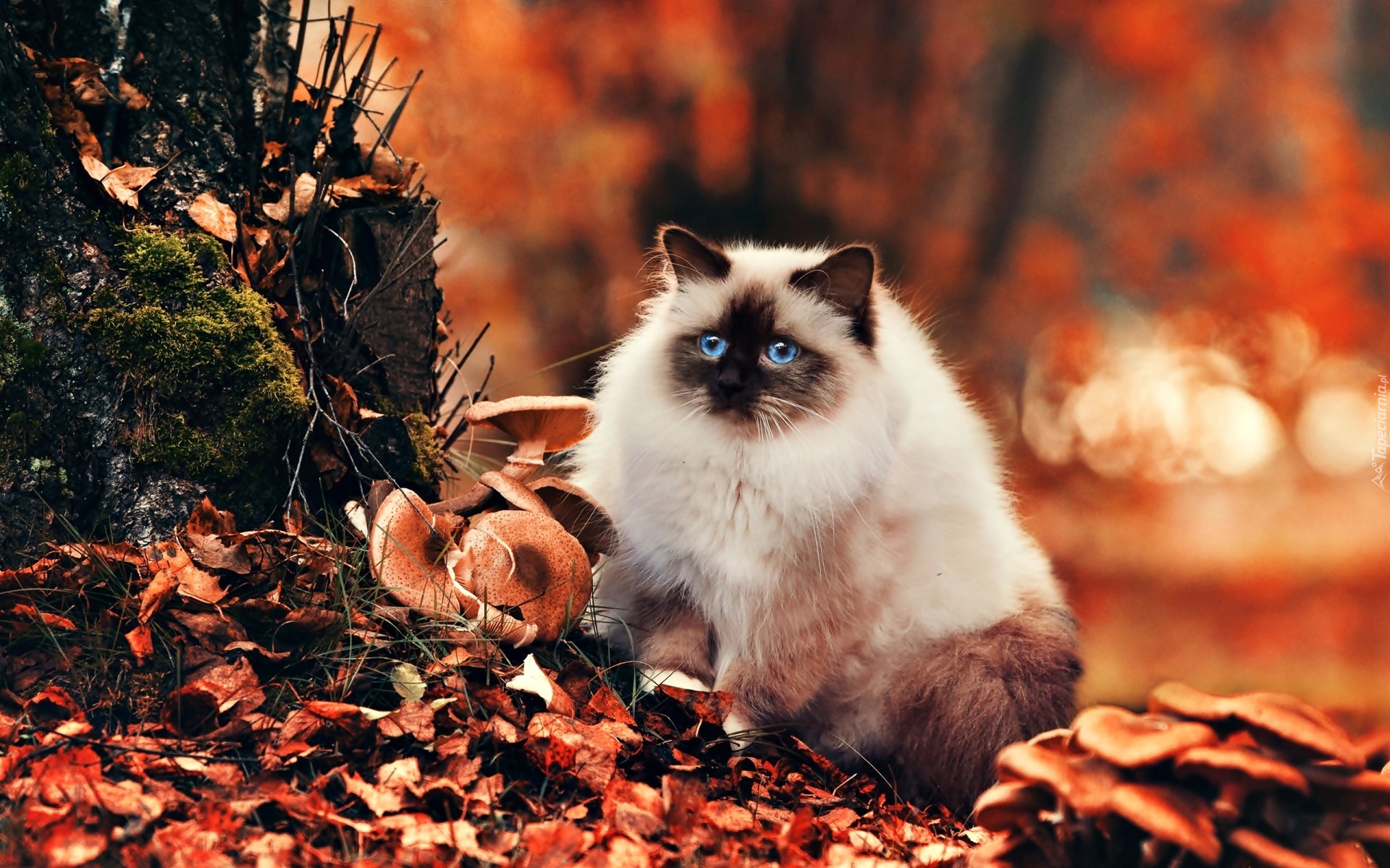 Edytor tapety: Kot, Syjamski, Jesień, Liście, Grzyby