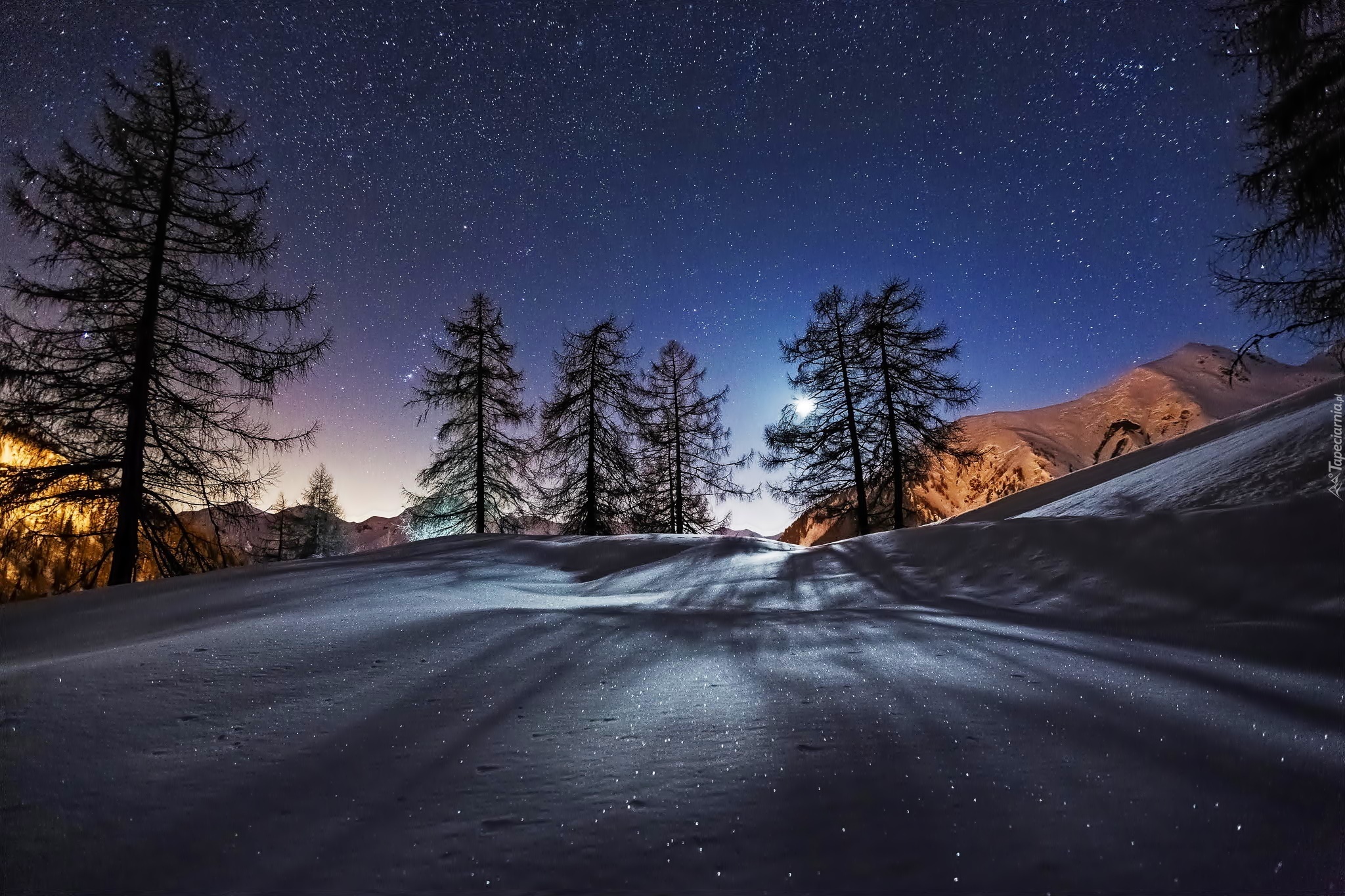 Edytor tapety: Zima, Noc, Góry, Drzewa, Gwiazdy
