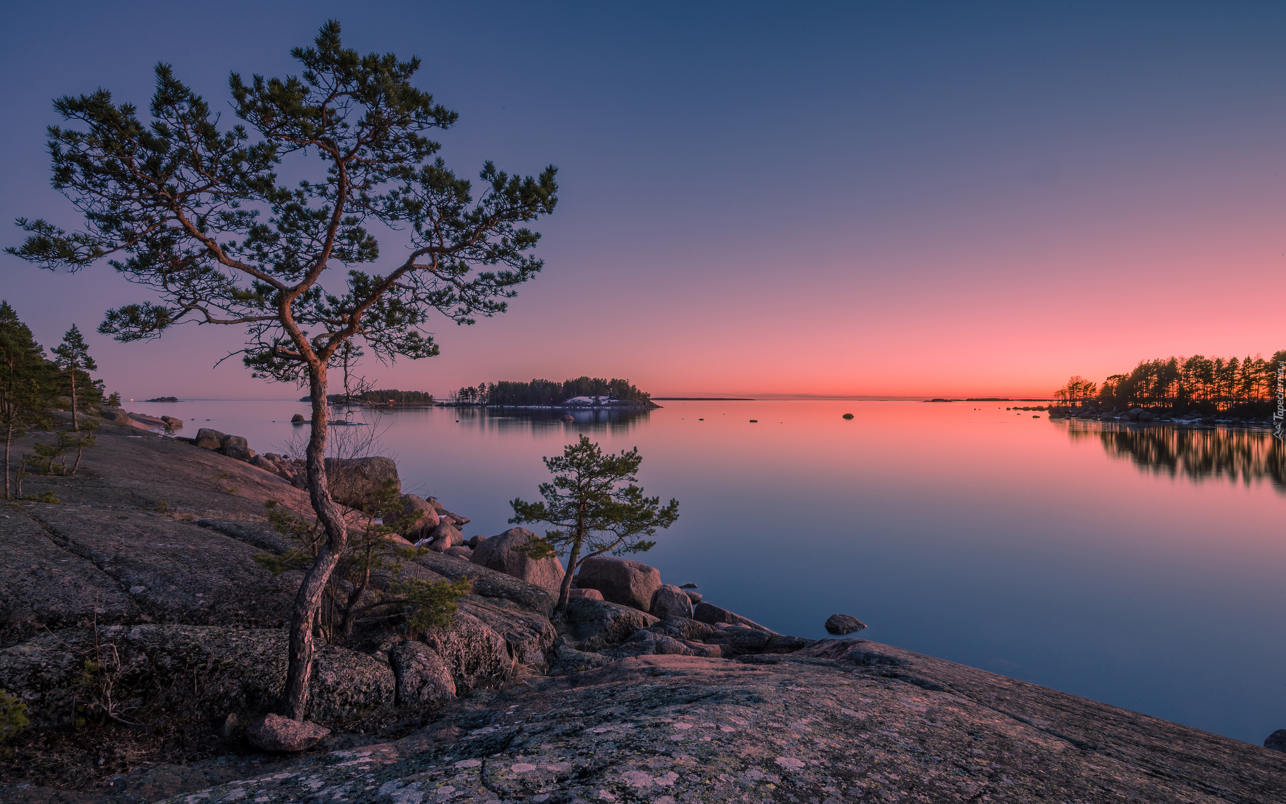 Edytor tapety: Jezioro, Skały, Zachód Słońca, Drzewa