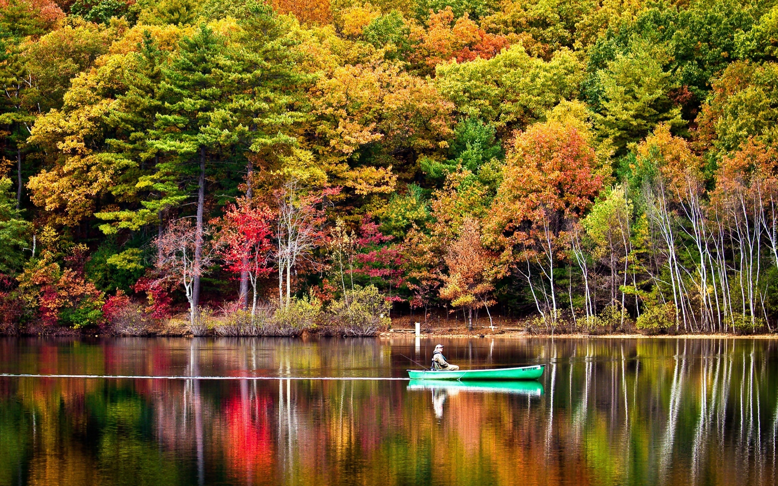 Edytor tapety: Jezioro, Wędkarz, Łódka, Las, Kolorowe, Drzewa, Jesień