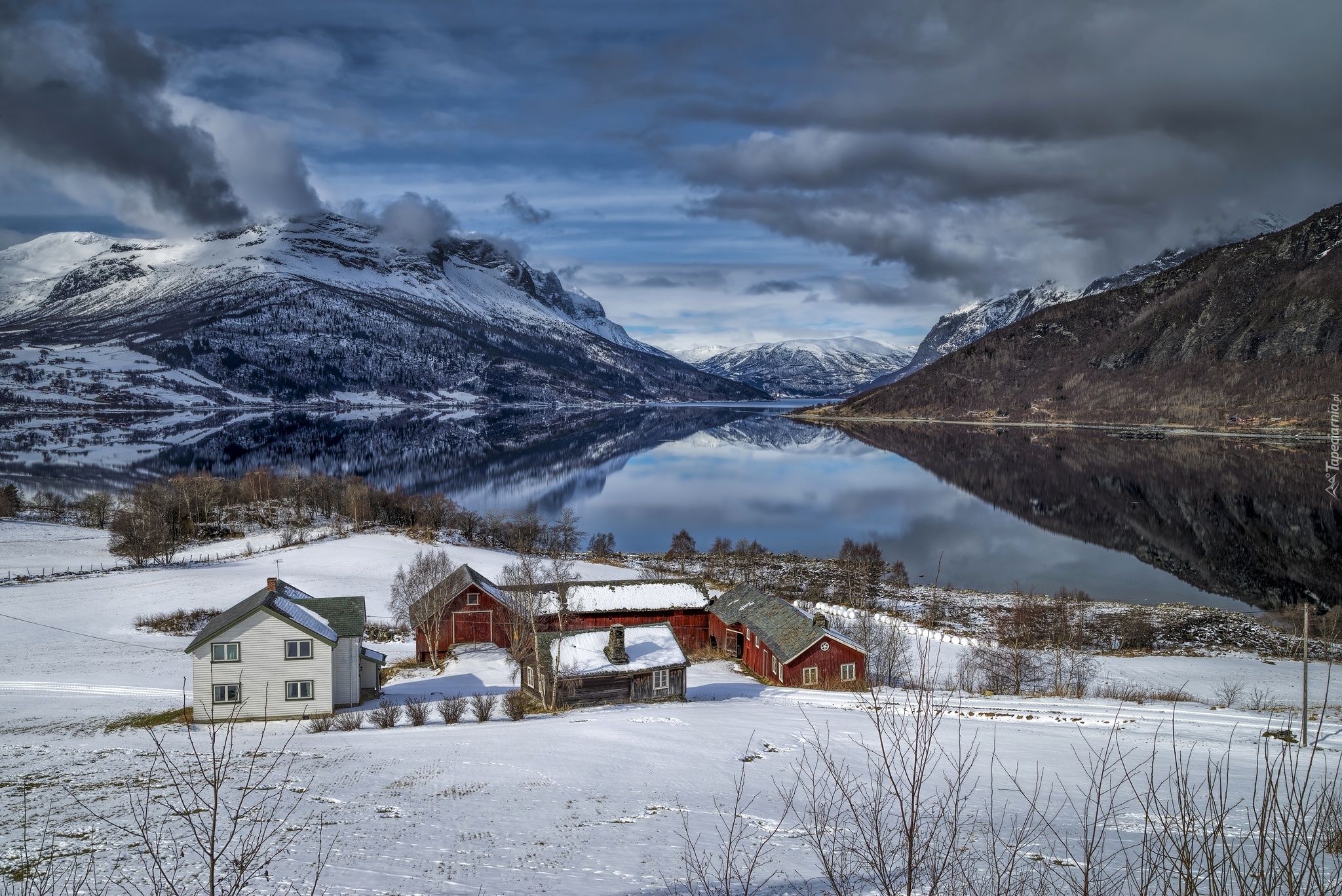 Edytor tapety: Zima, Góry, Jezioro, Domy, Drzewa, Śnieg, Valdres, Norwegia