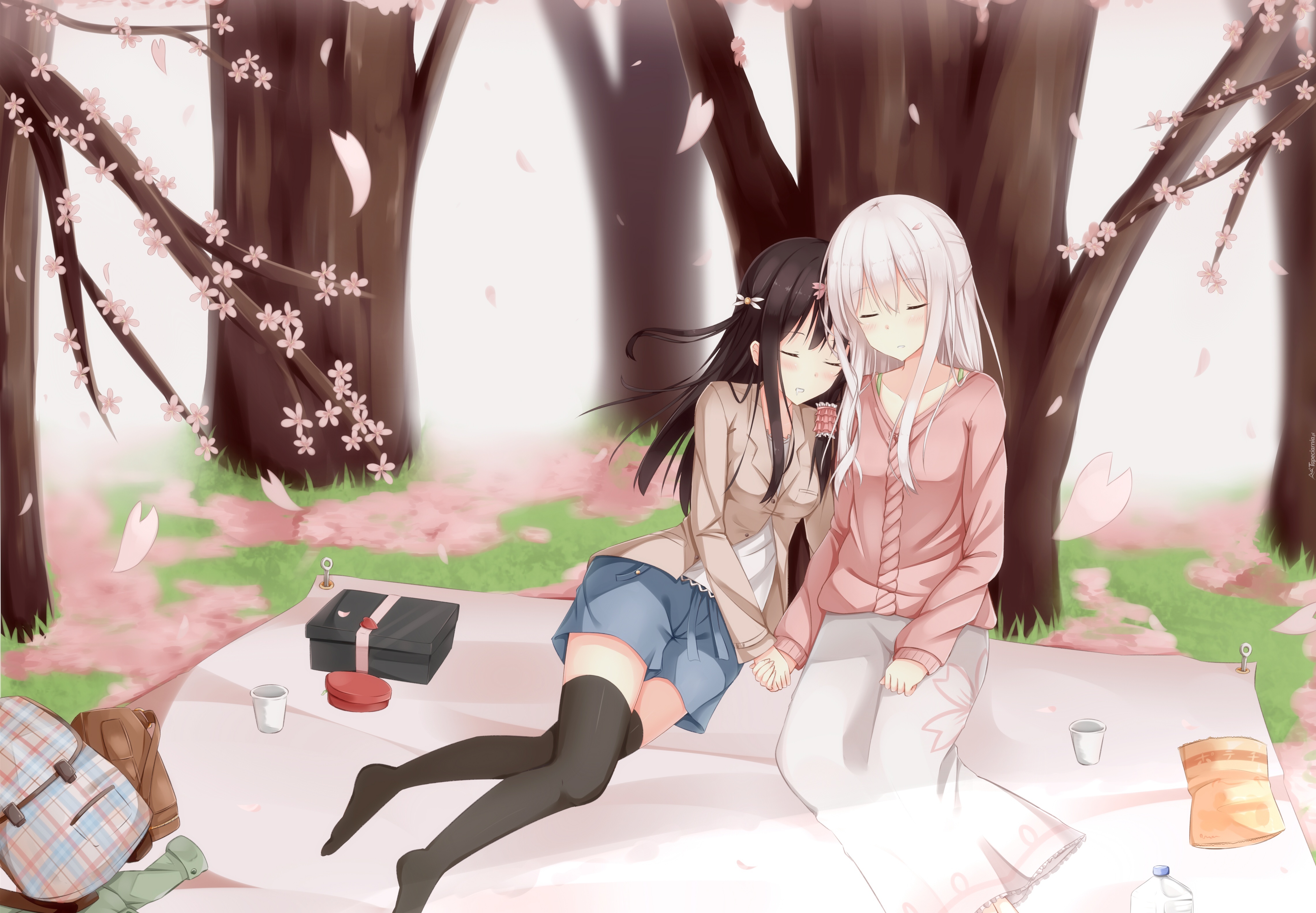 Edytor tapety: Dwie, Dziewczyny, Drzewa, Piknik, Anime
