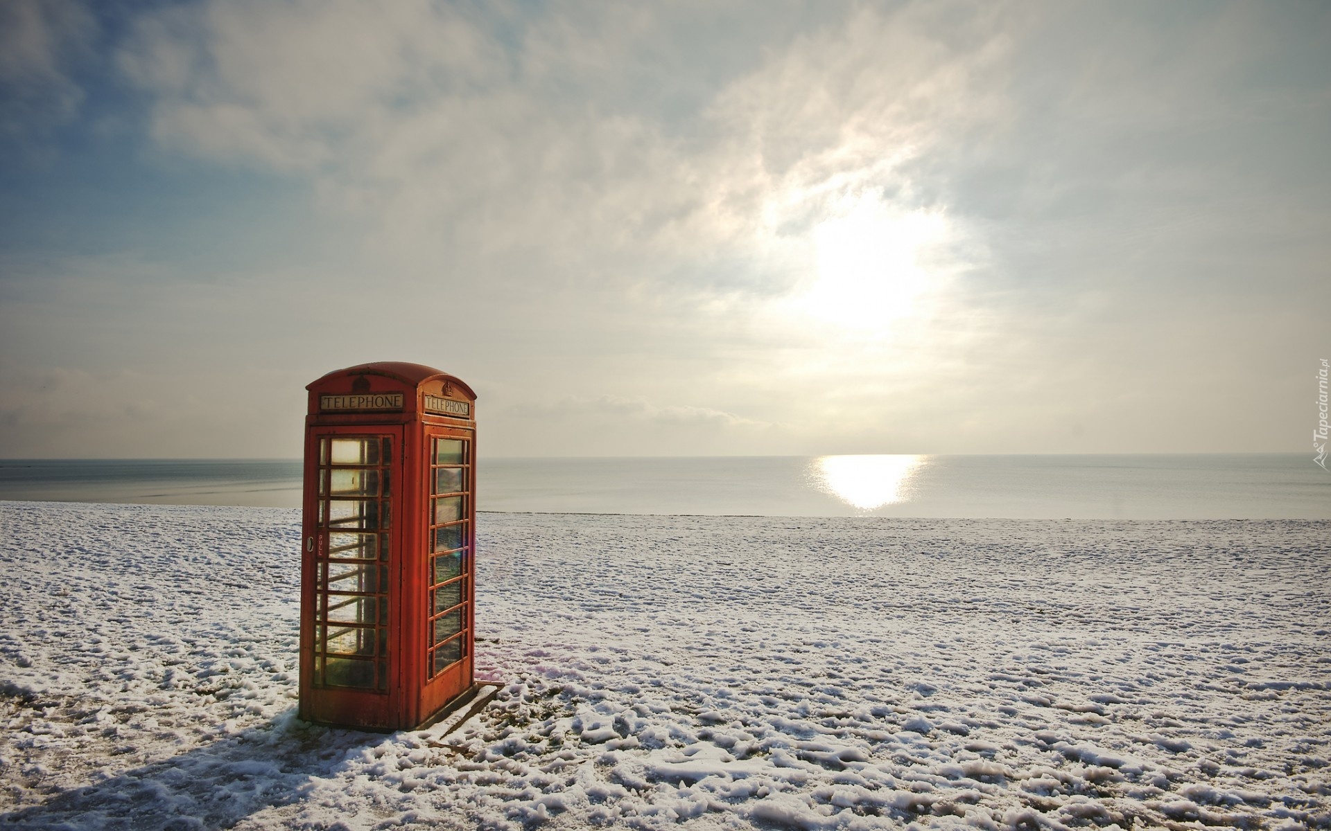 Edytor tapety: Budka, Telefoniczna, Na, Plaży, Morze, Śnieg
