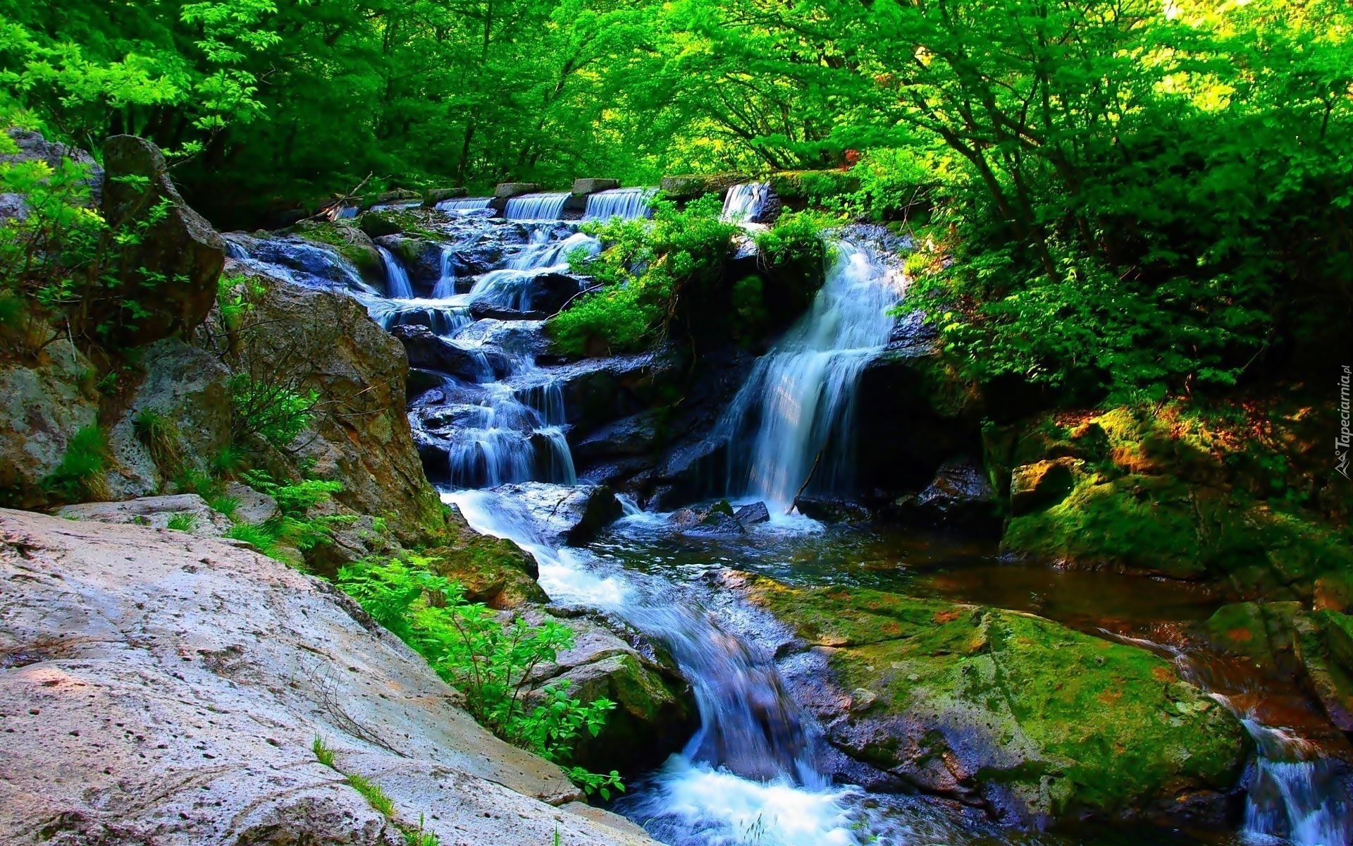 Edytor tapety: Kaskadowy, Wodospad, Las, Drzewa, Skały