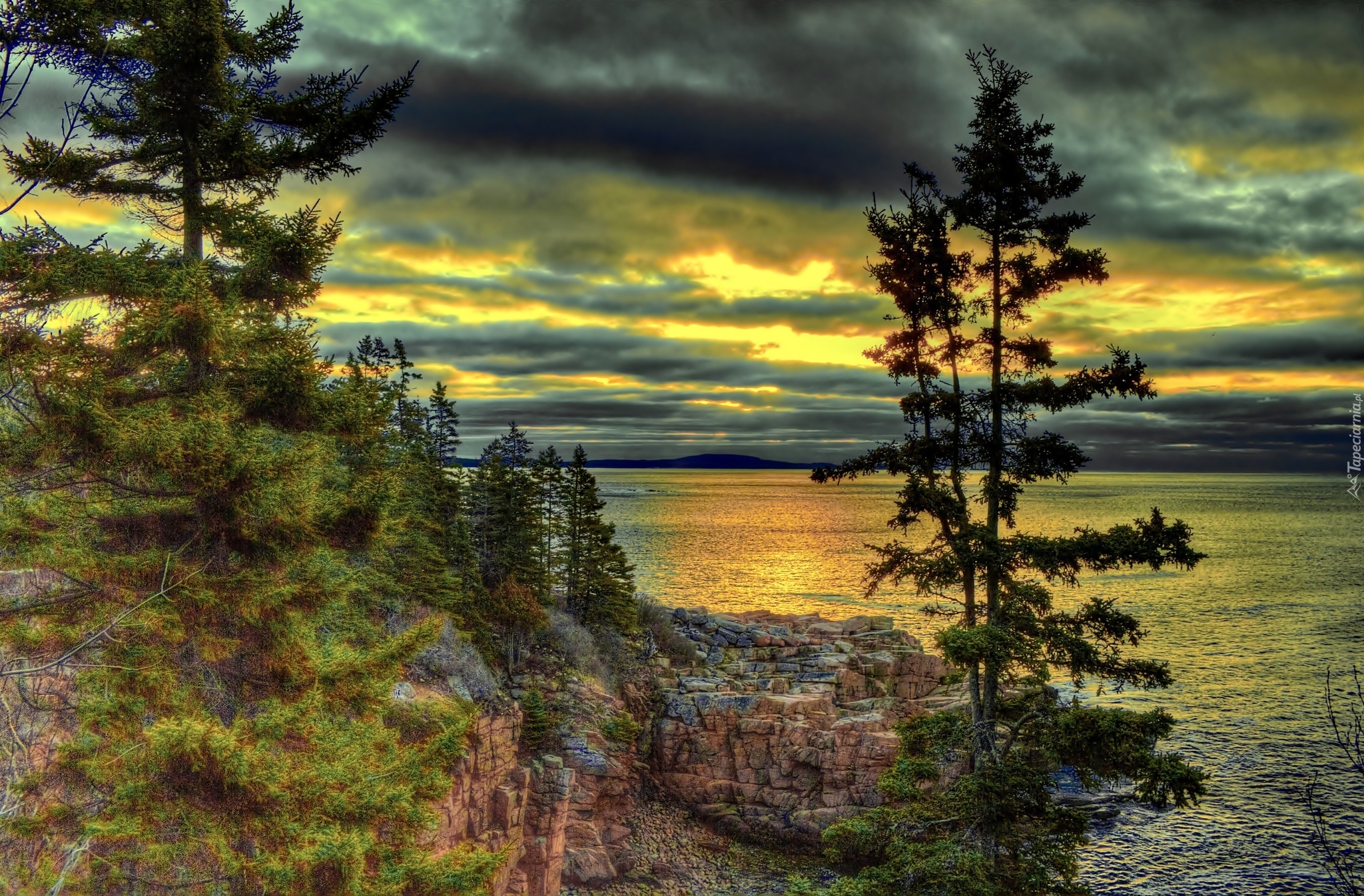 Edytor tapety: Chmury, Jezioro, Wybrzeże, Drzewa, Norwegia, HDR