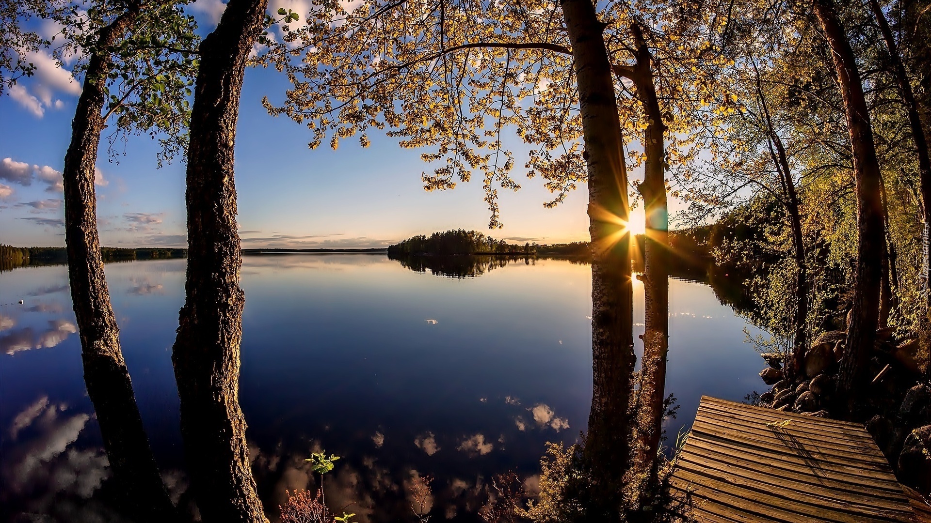 Edytor tapety: Jezioro, Promienie, Słońca, Drzewa