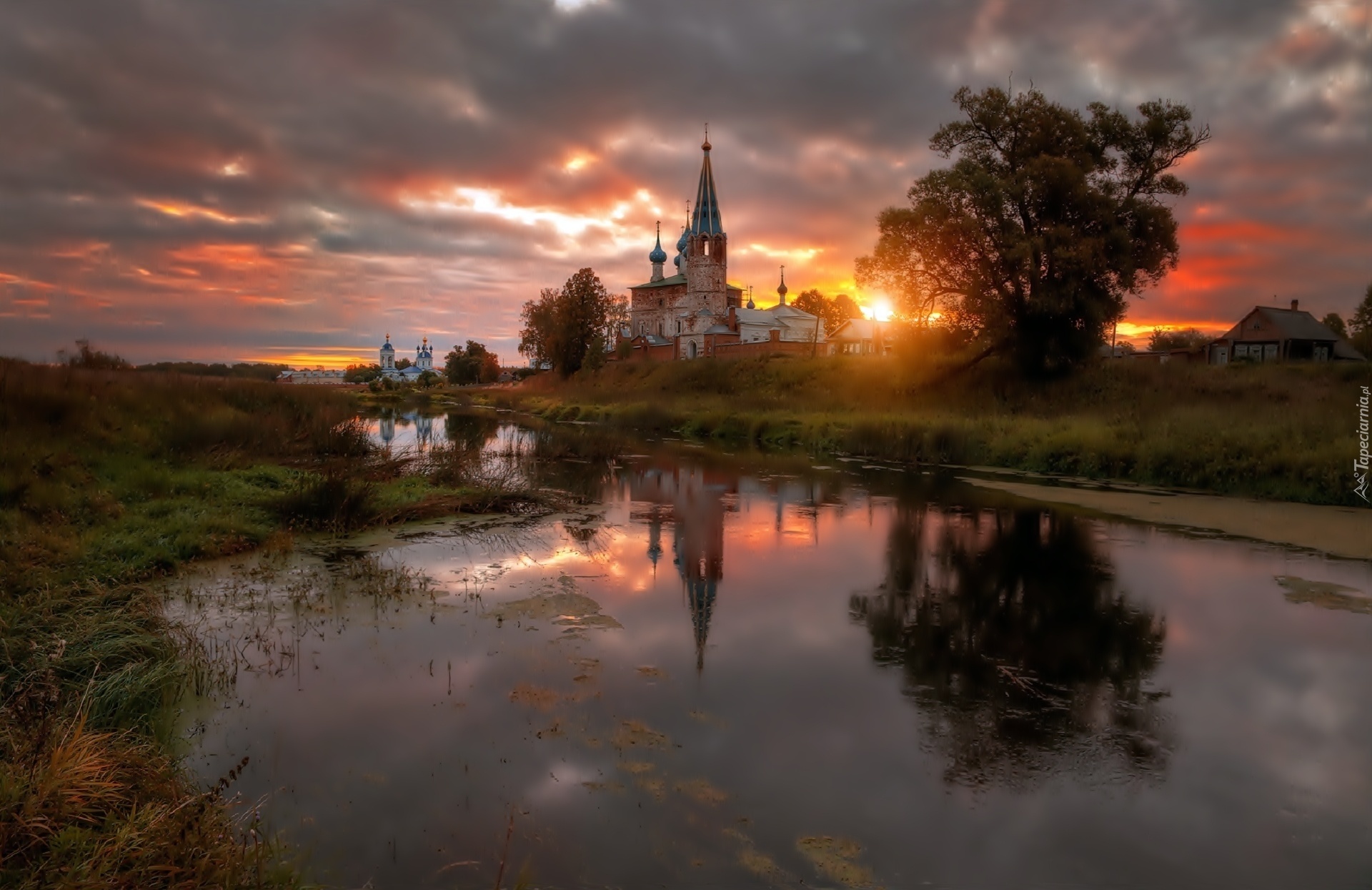 Edytor tapety: Kościół, Rzeka, Wschód Słońca