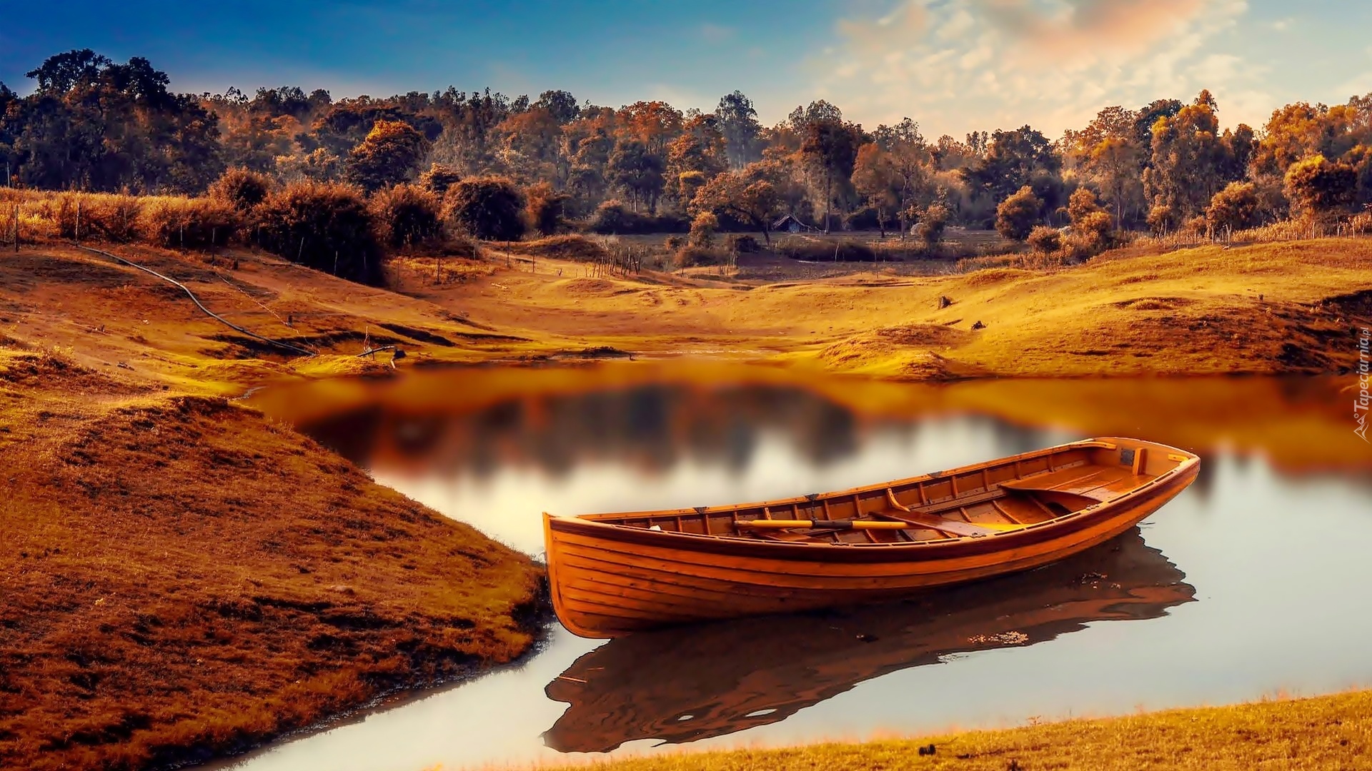 Edytor tapety: Łódka, Staw, Drzewa, Las, Jesień