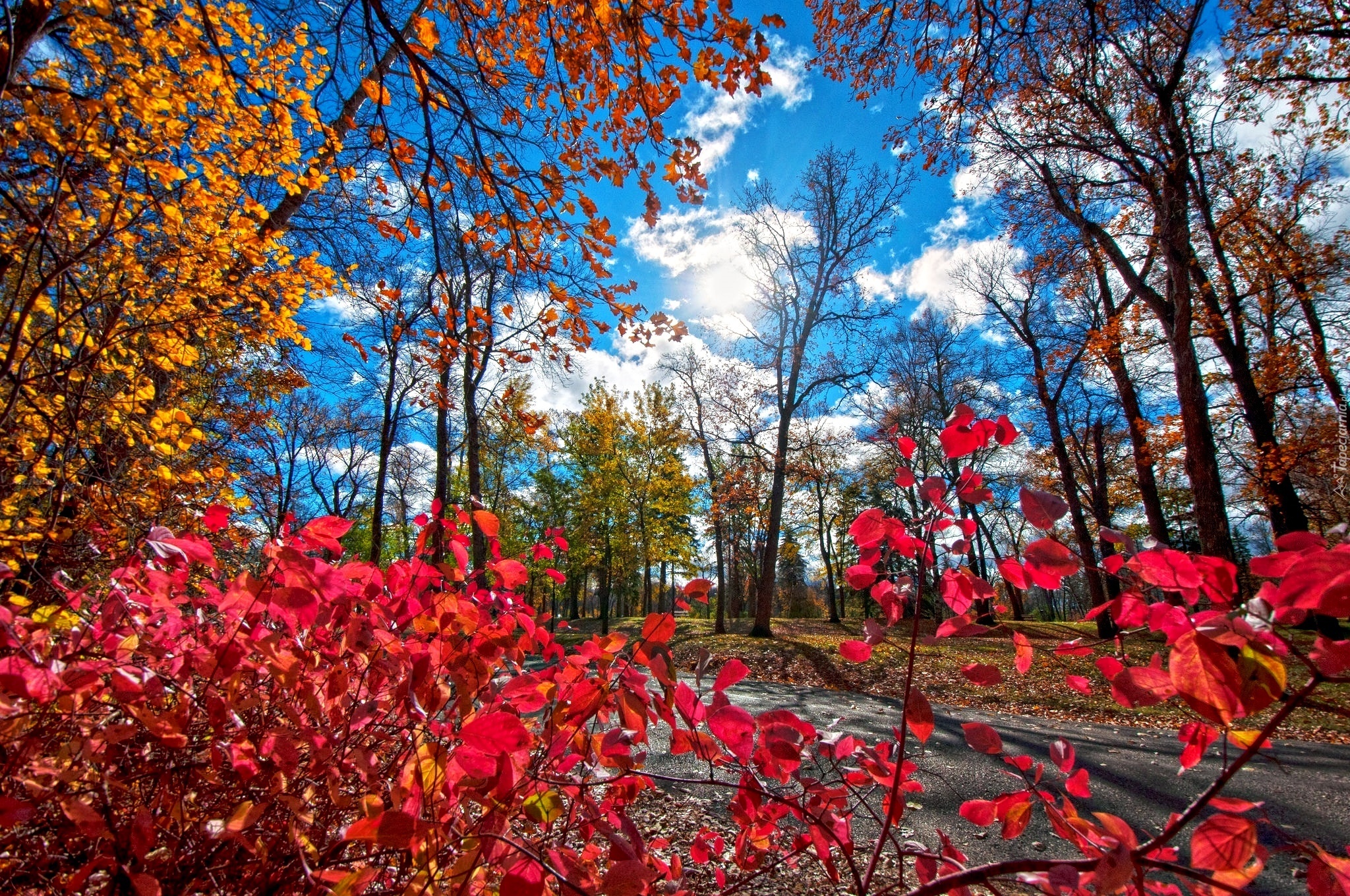Edytor tapety: Jesień, Niebo, Słońce, Poranek, Kolorowe Liście, Drzewa