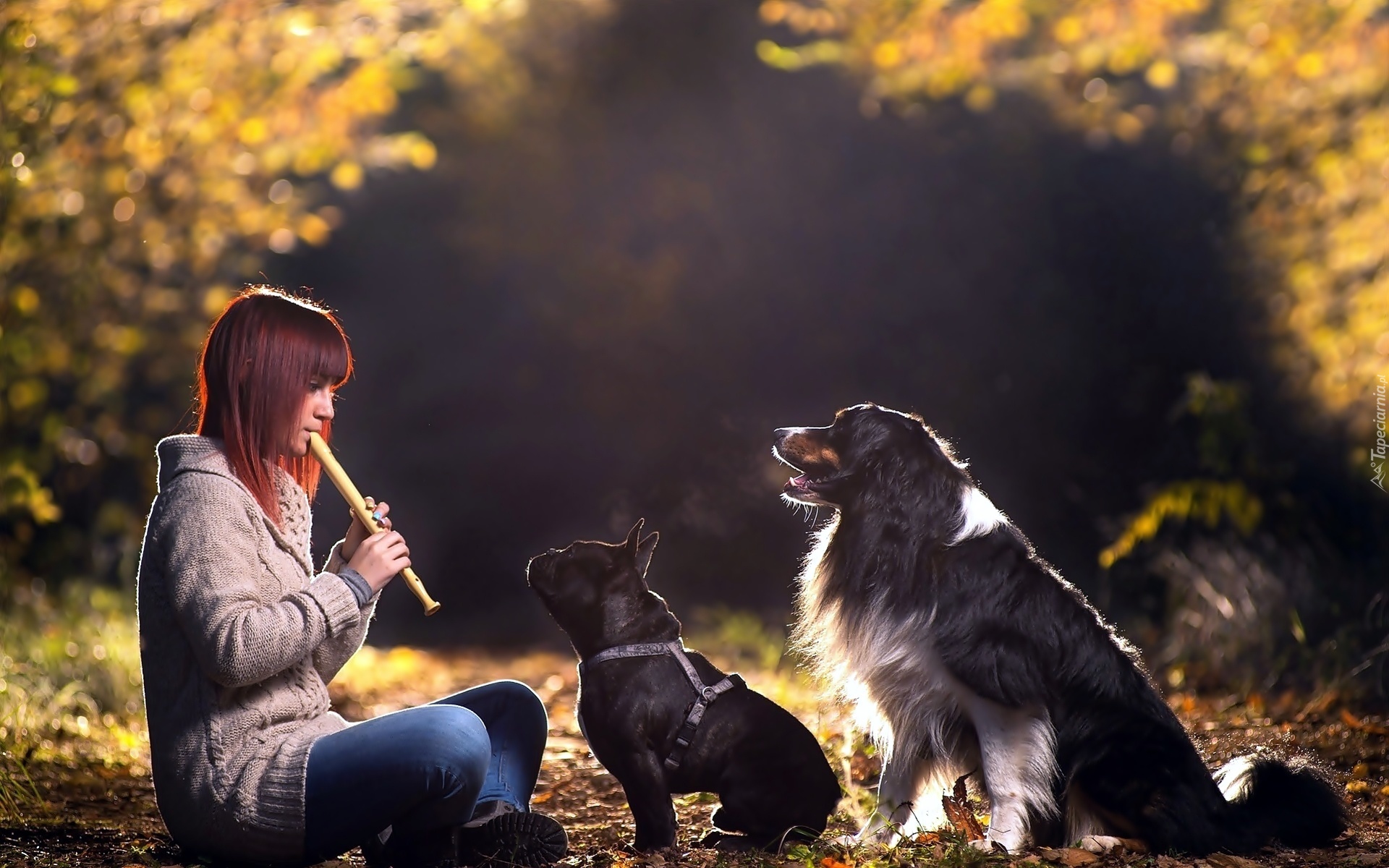 Edytor tapety: Dziewczyna, Flet, Zasłuchane, Psy, Droga, Las, Jesień