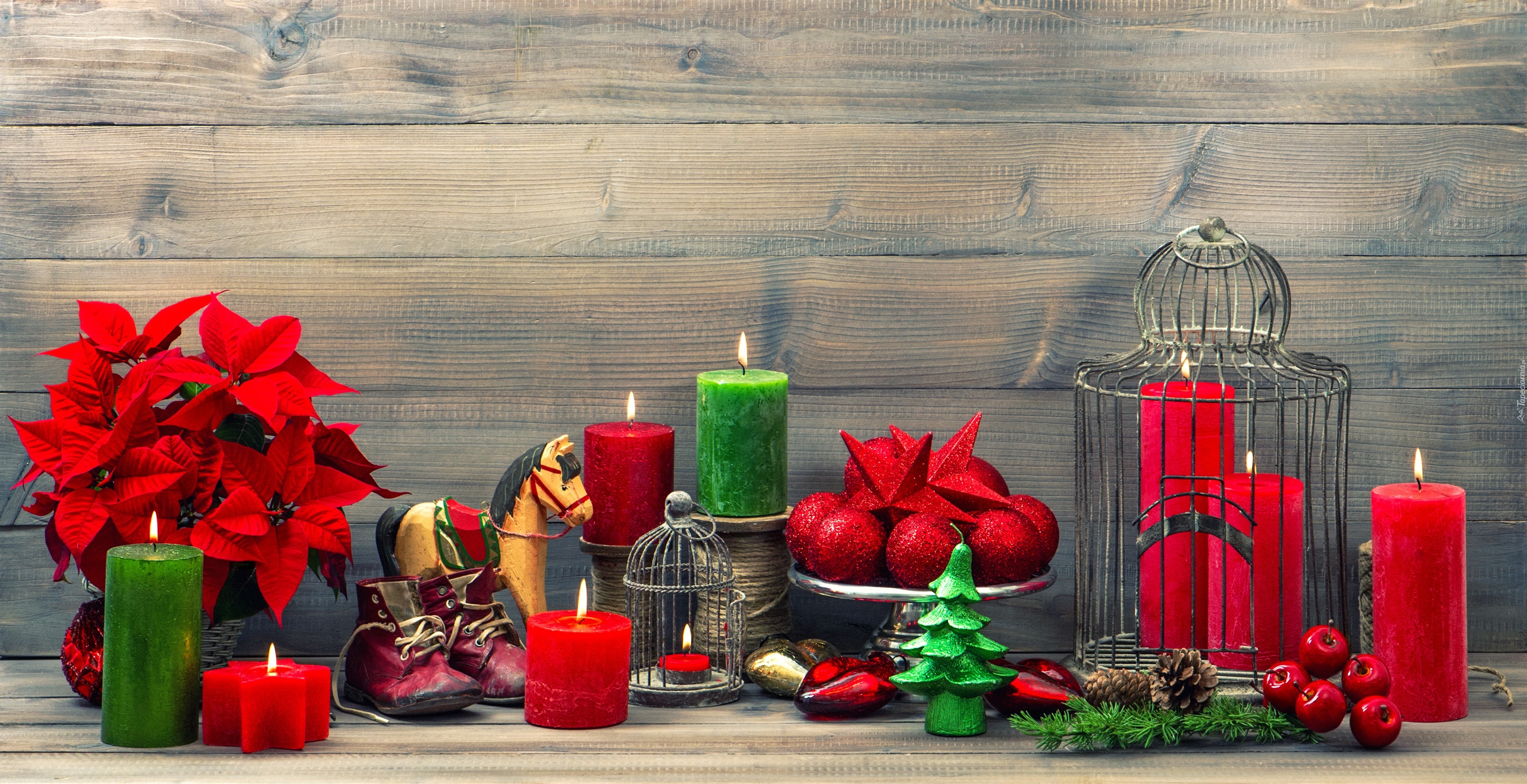 Edytor tapety: Kompozycja, Świąteczna, Gwiazda, Betlejemska, Świece, Buty, Drewniany, Konik
