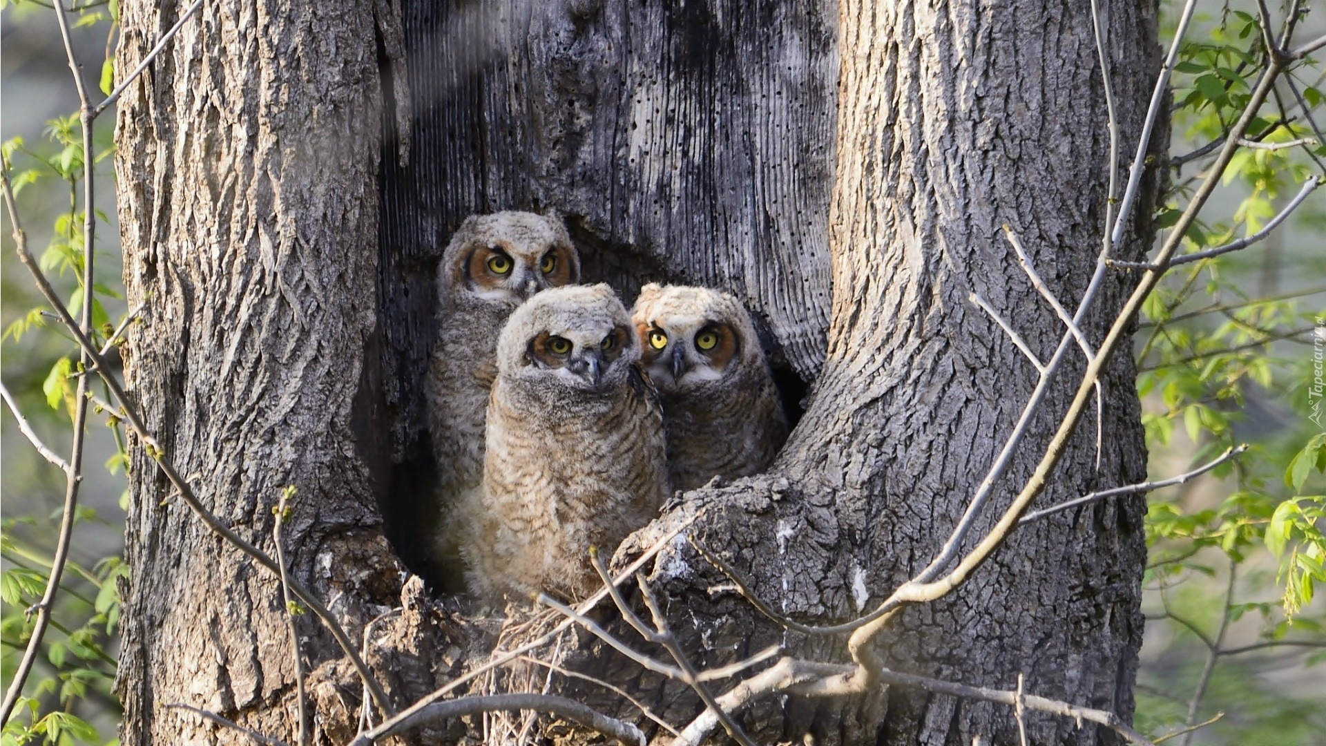 Edytor tapety: Trzy, Sowy, Drzewo, Dziupla, Las