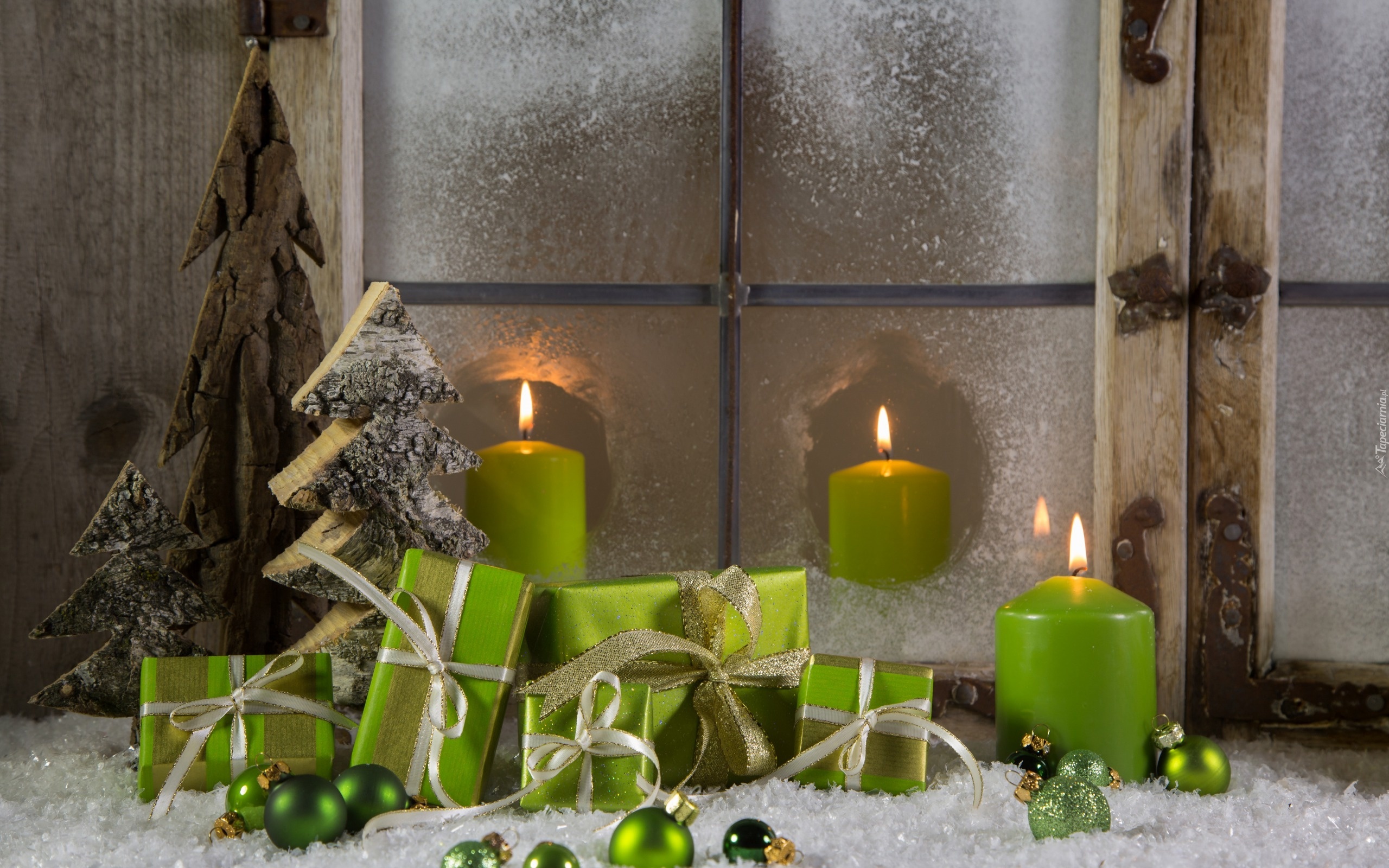 Edytor tapety: Kompozycja, Świąteczne, Zielone, Świeczki, Bombki, Prezenty, Okno