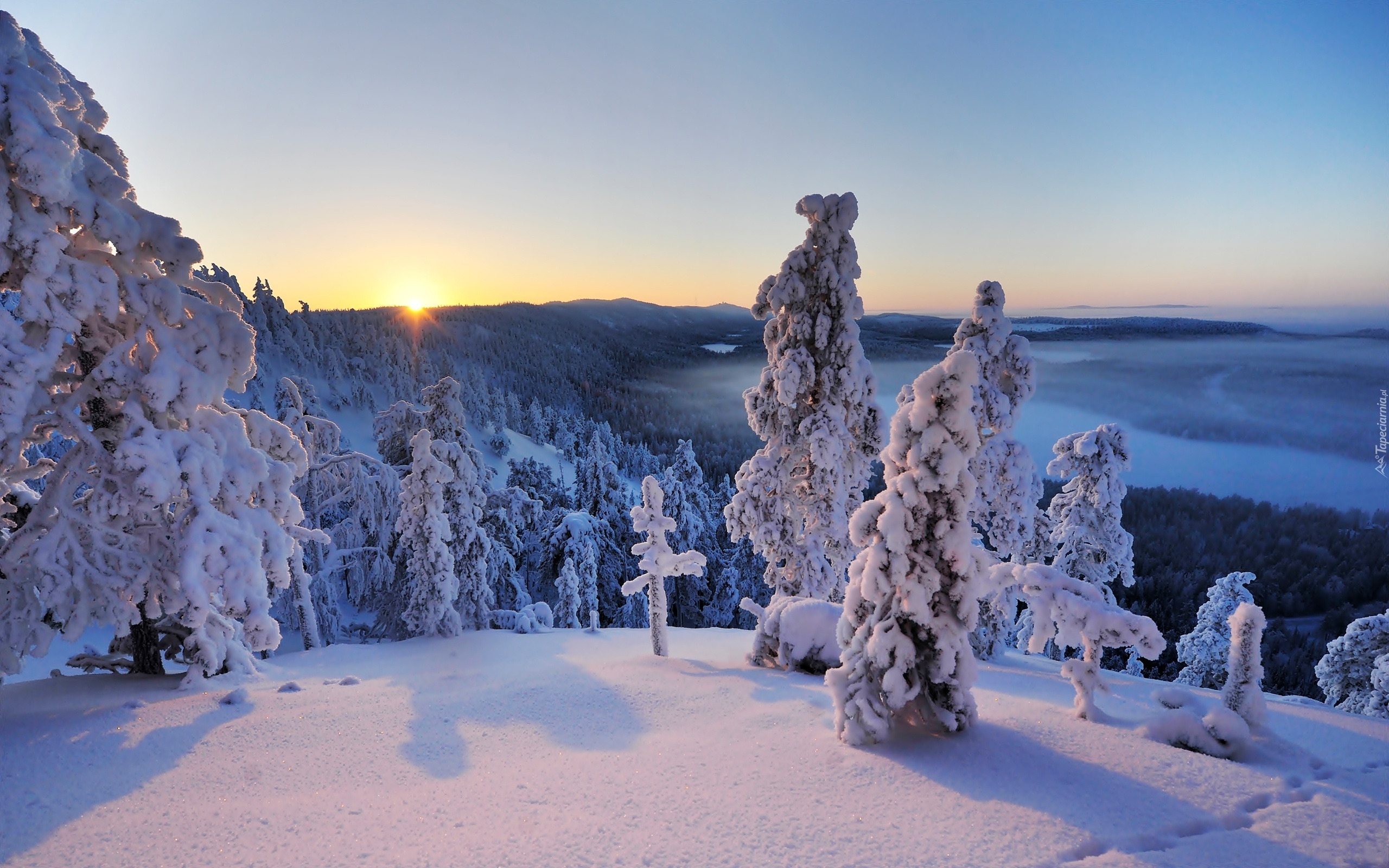 Edytor tapety: Zima, Góry, Lasy, Zachód Słońca, Kuusamo, Finlandia