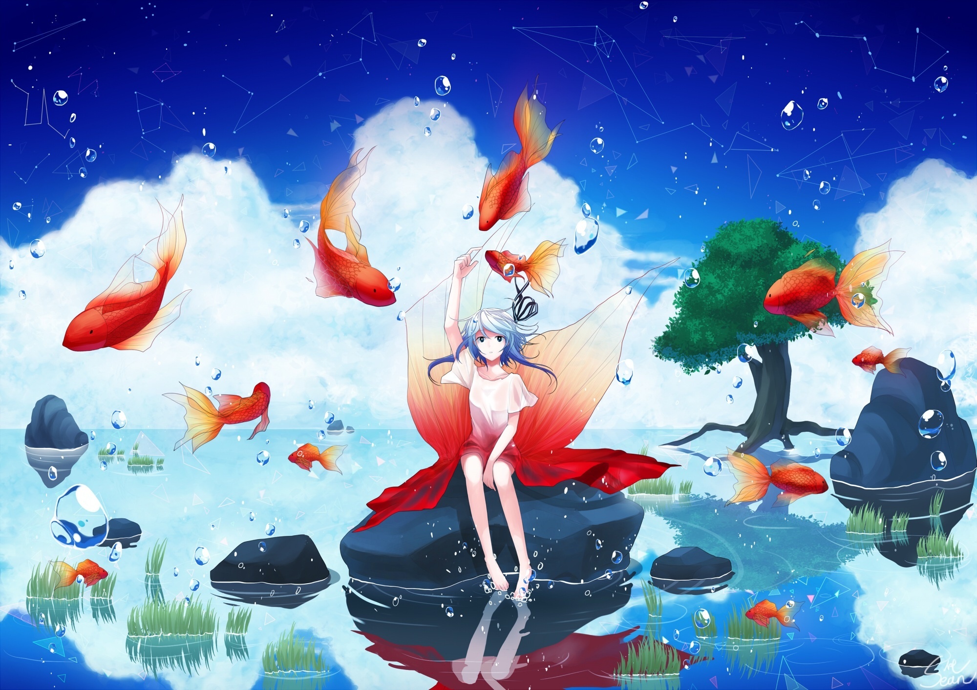 Edytor tapety: Dziewczyna, Ryby, Woda, Kamienie, Drzewo, Anime