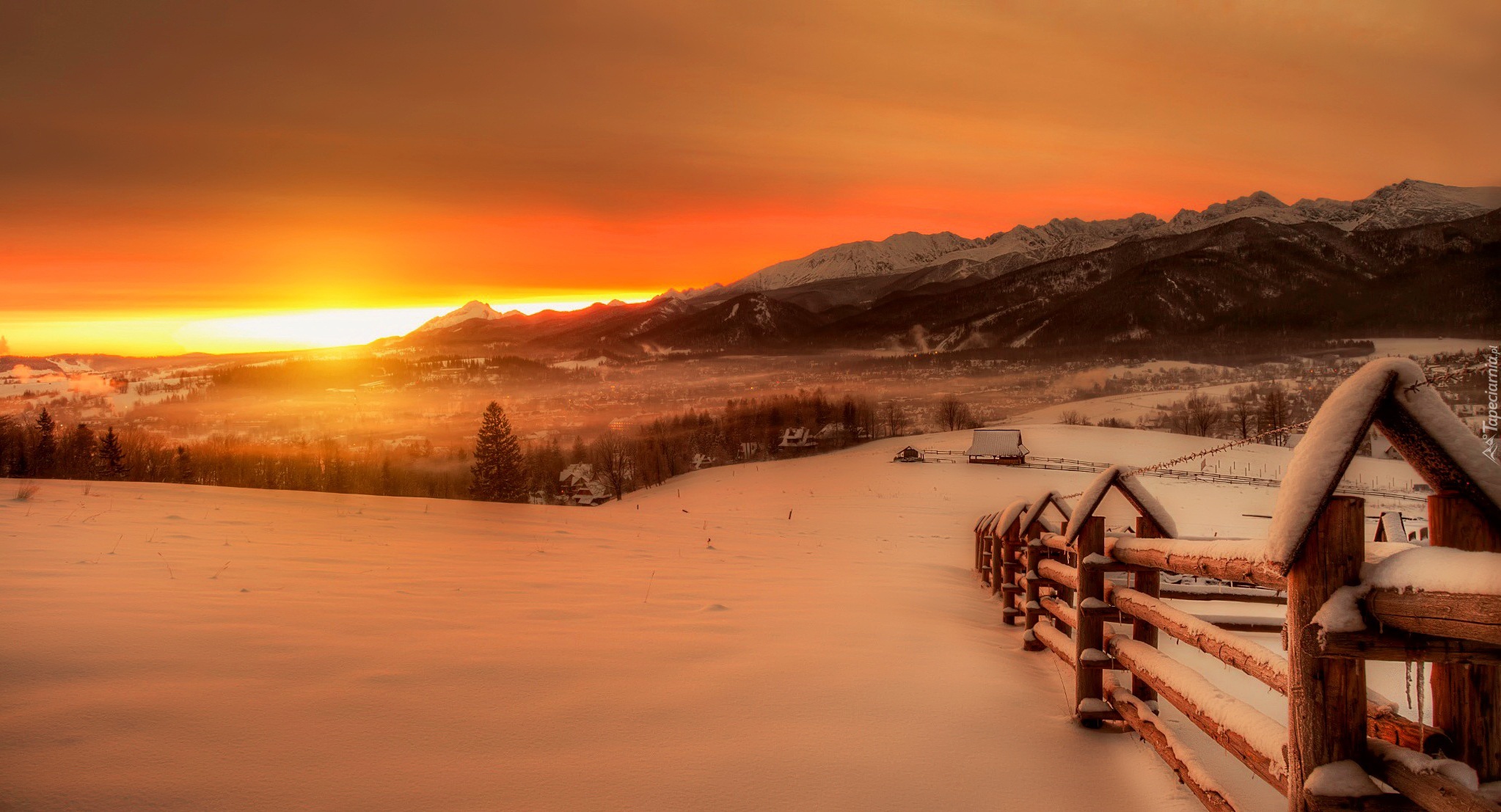 Edytor tapety: Zachód, Słońca, Zima, Śnieg, Góry