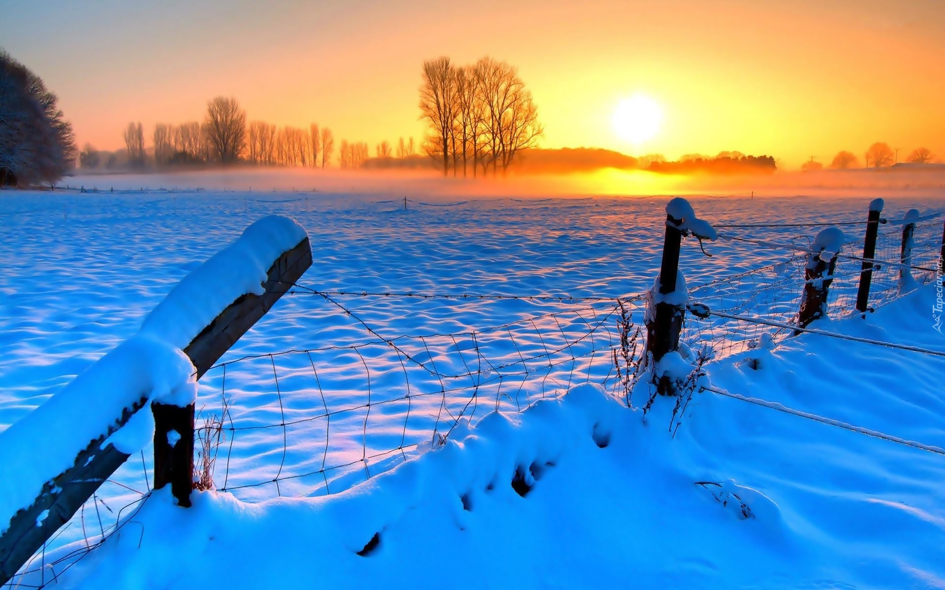 Edytor tapety: Pola, Drzewa, Ogrodzenie, Piękny, Wschód, Słońca, Zima