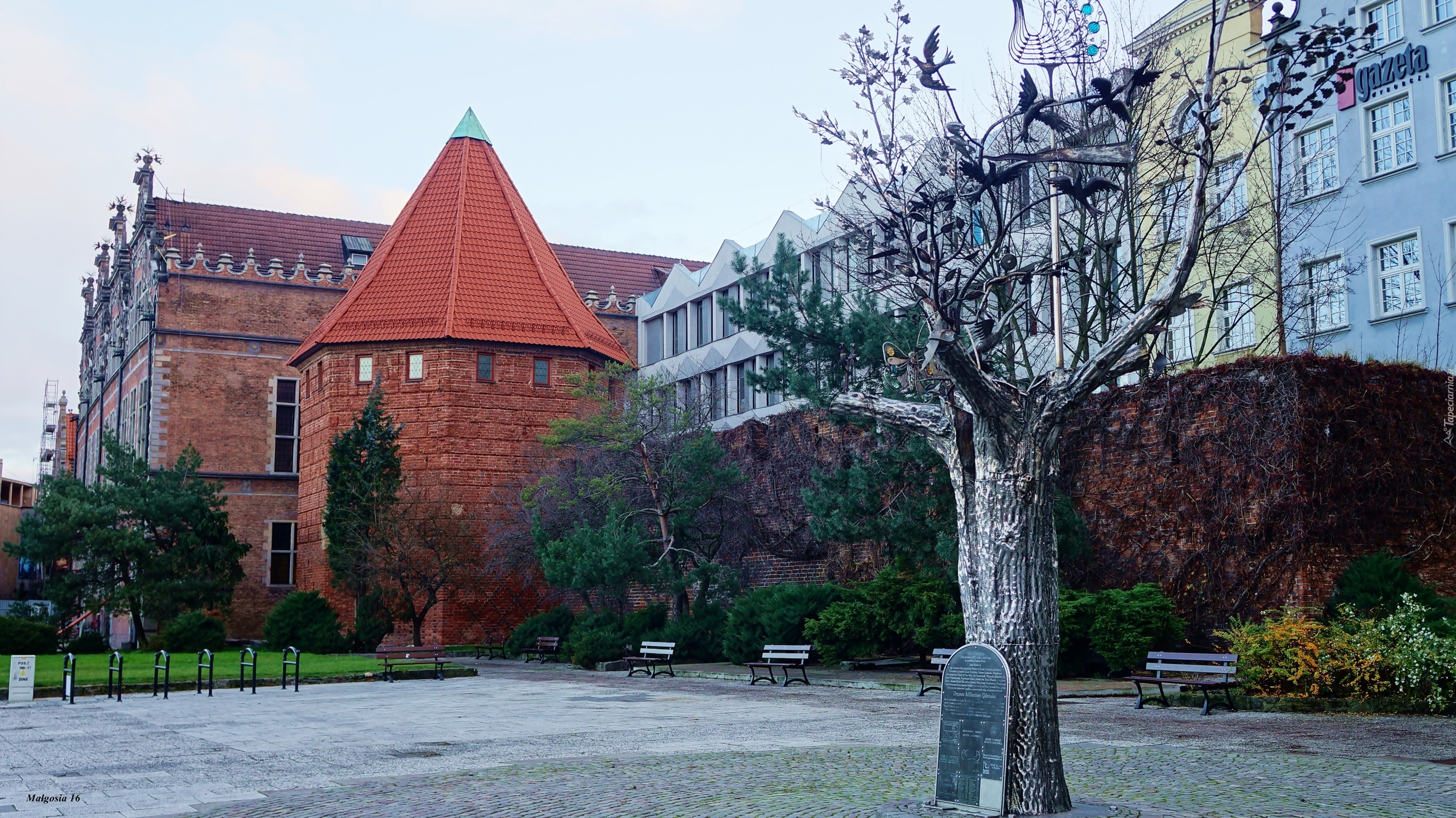 Edytor tapety: Miasto, Gdańsk, Budynki, Plac, Rzeźba, Drzewo, Ławki