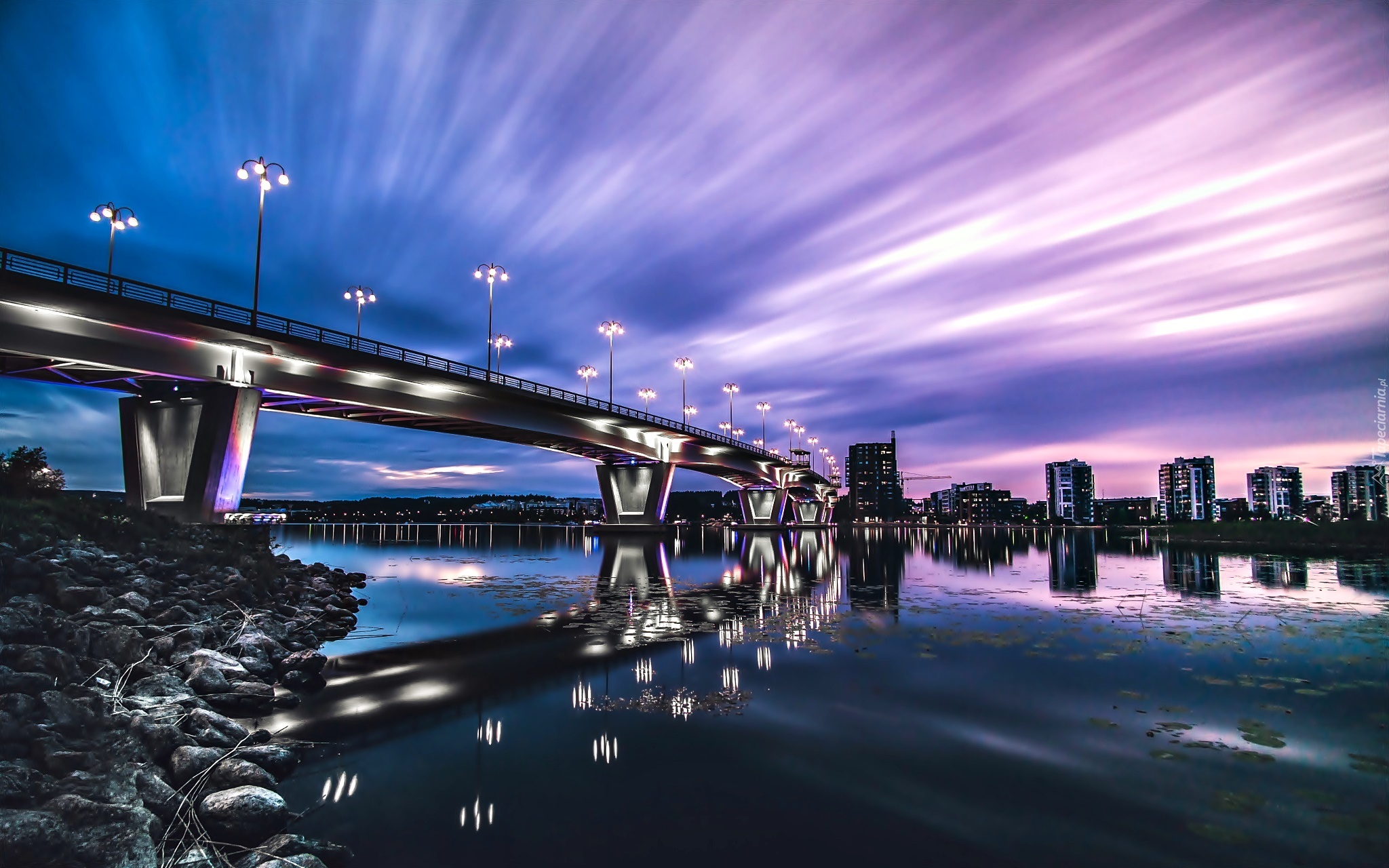 Edytor tapety: Rzeka, Most, Miasto, Zmierzch, Światła
