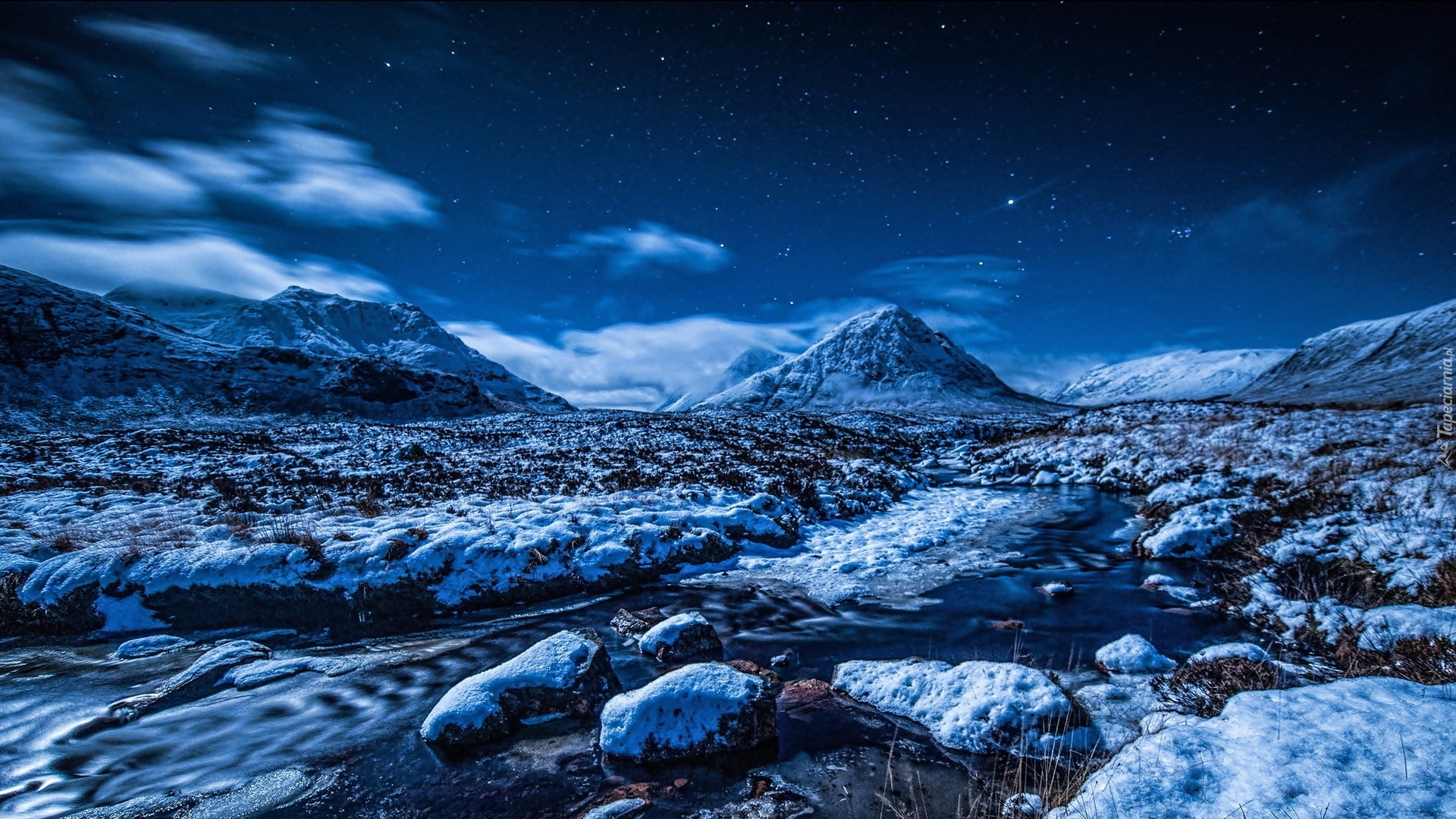 Edytor tapety: Góry, Rzeczka, Kamienie, Śnieg,Noc
