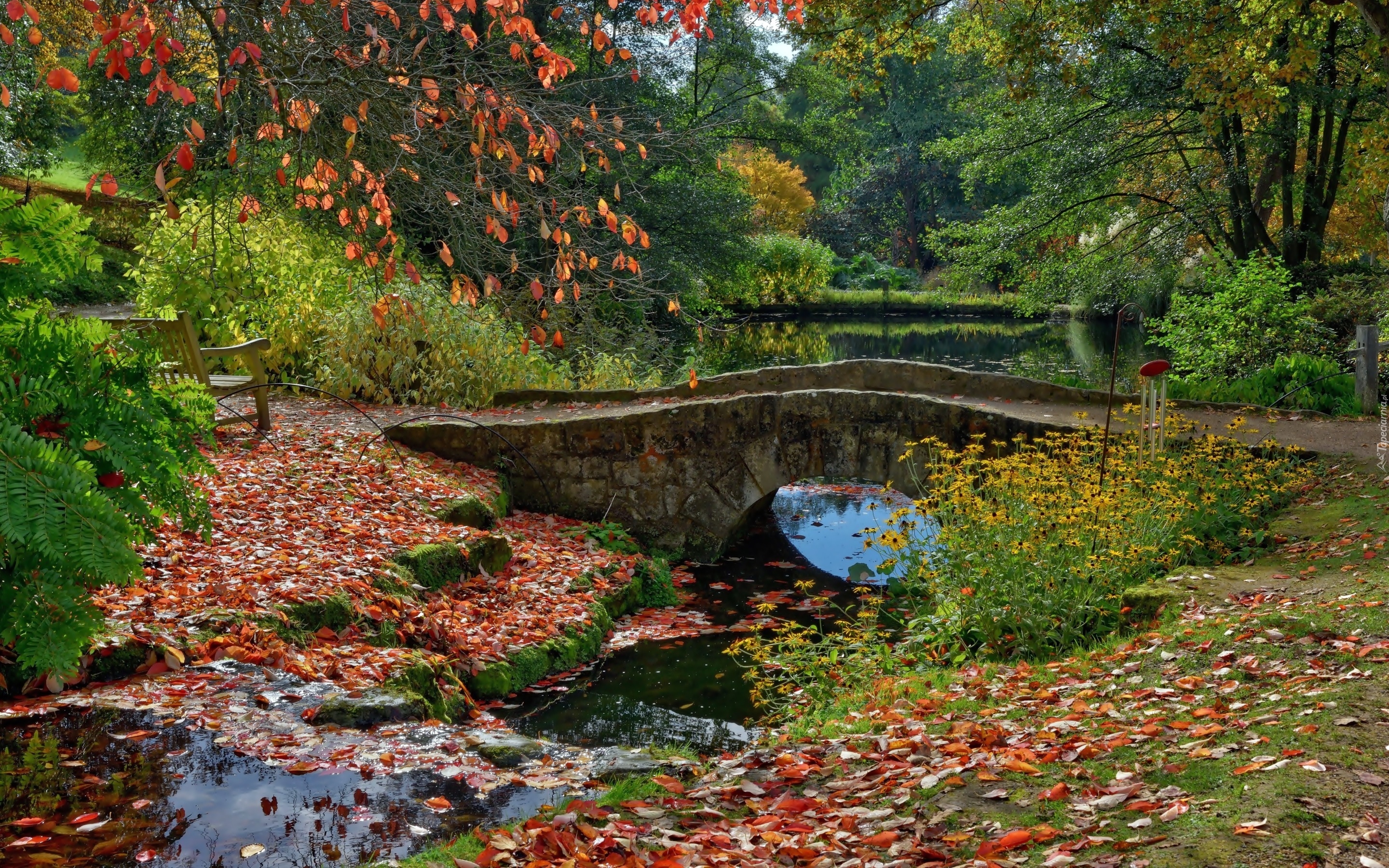 Edytor tapety: Staw, Mostek, Kwiaty, Liście, Park, Jesień, Anglia
