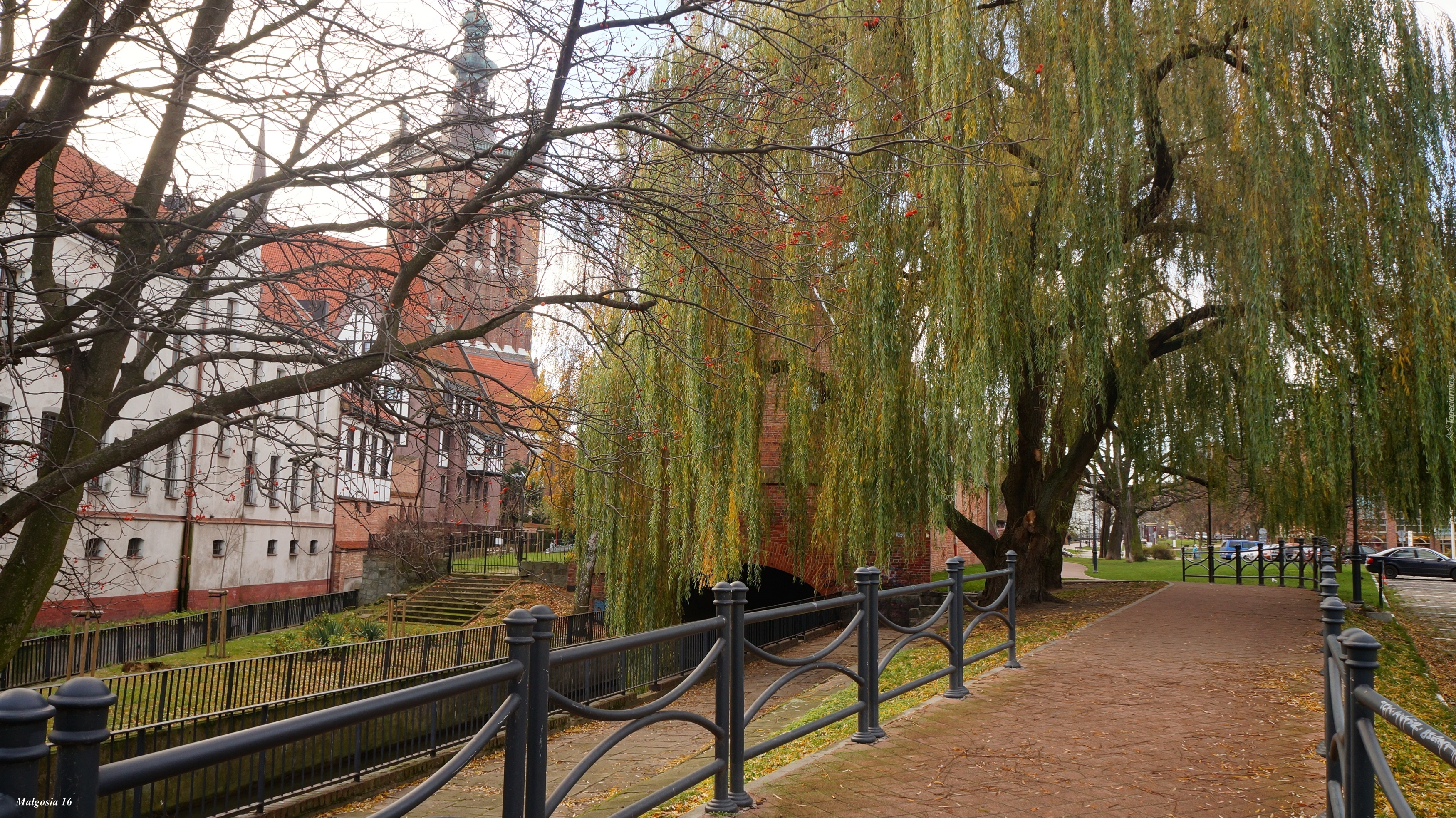 Edytor tapety: Gdańsk, Zabytkowe, Kamienice, Alejka, Drzewa, Wierzba