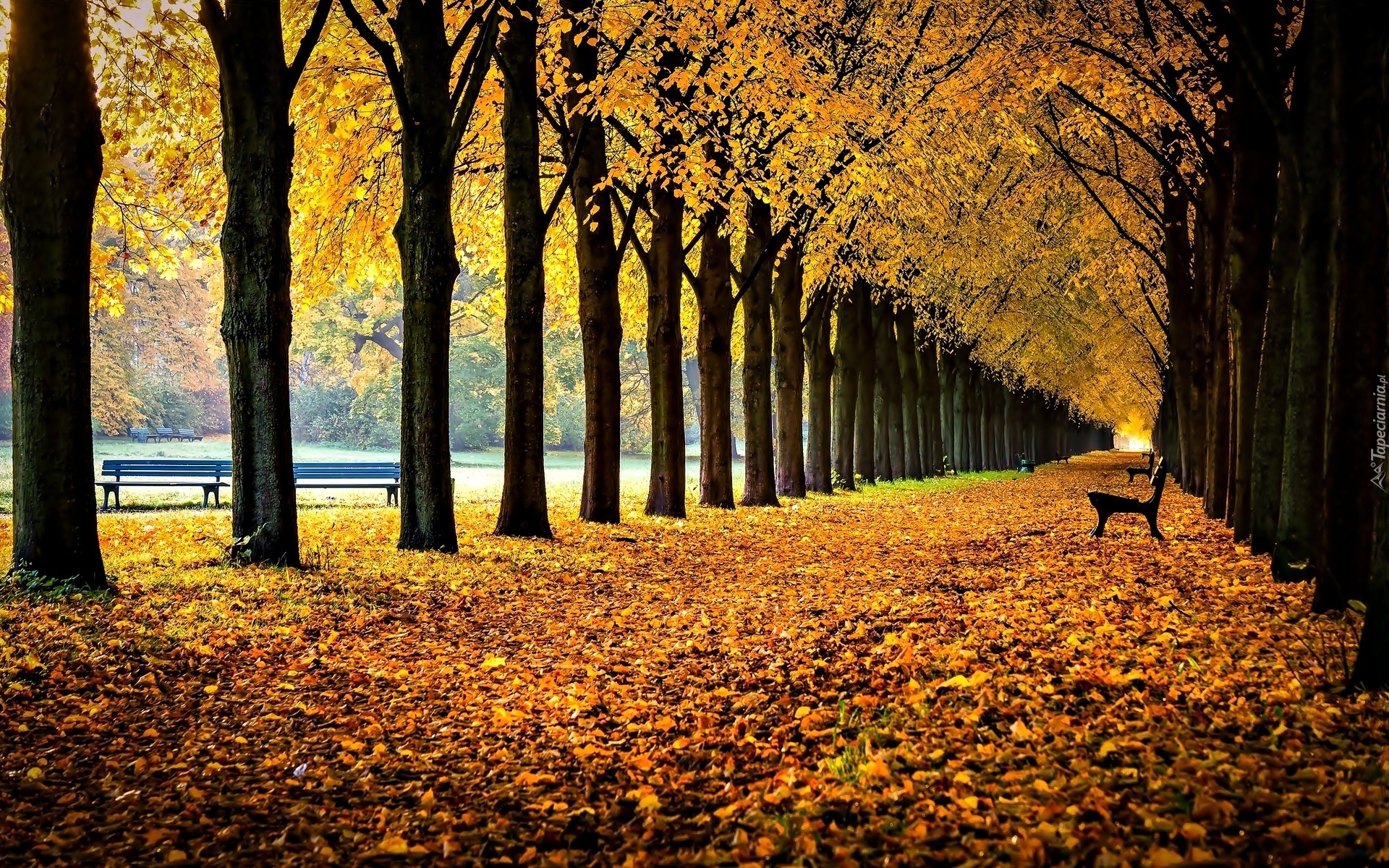 Edytor tapety: Jesień, Park, Aleja, Ławki, Liście, Drzewa