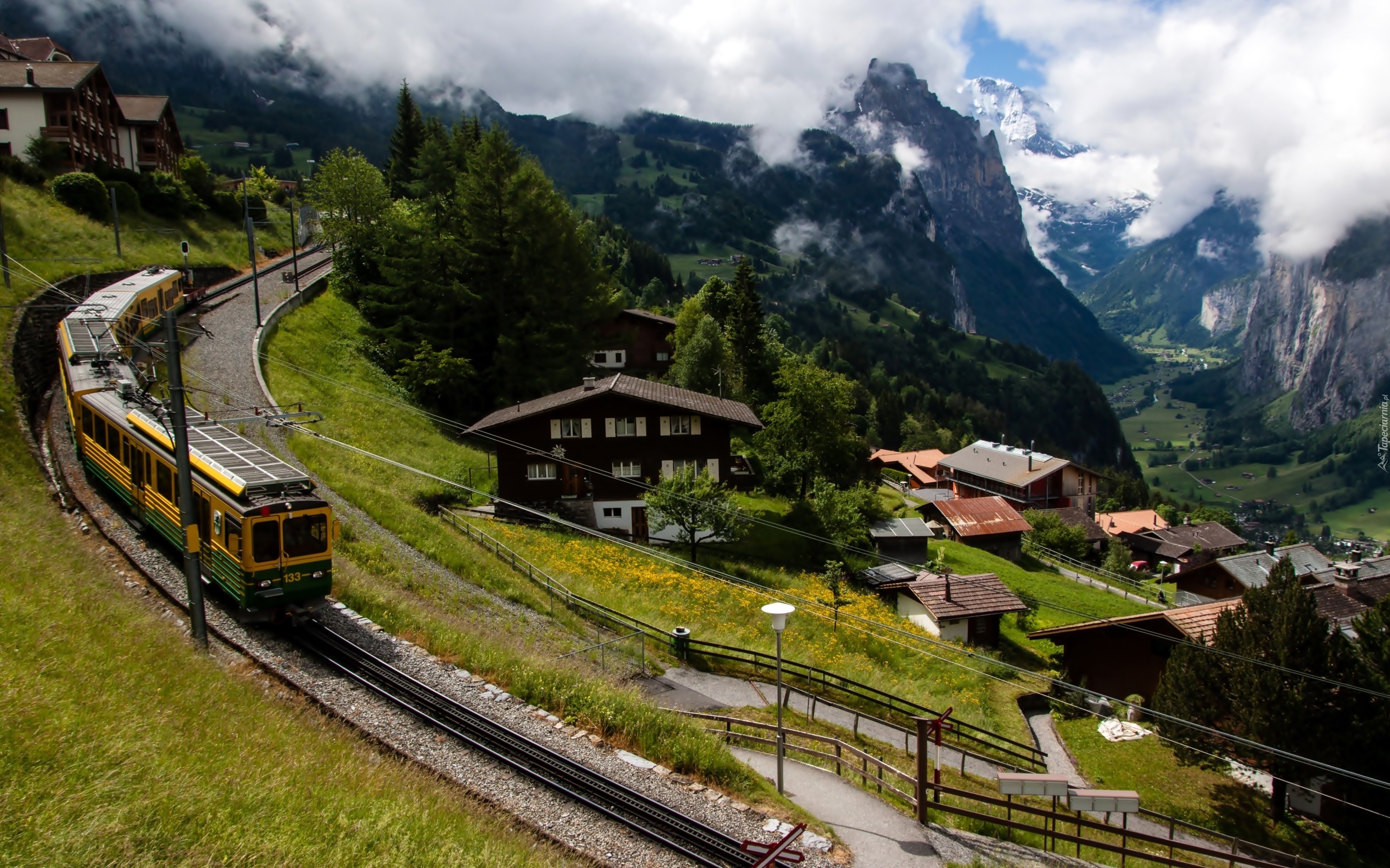 Edytor tapety: Domy, Kolej, Pociąg, Góry, Chmury, Lauterbrunnen, Szwajcaria