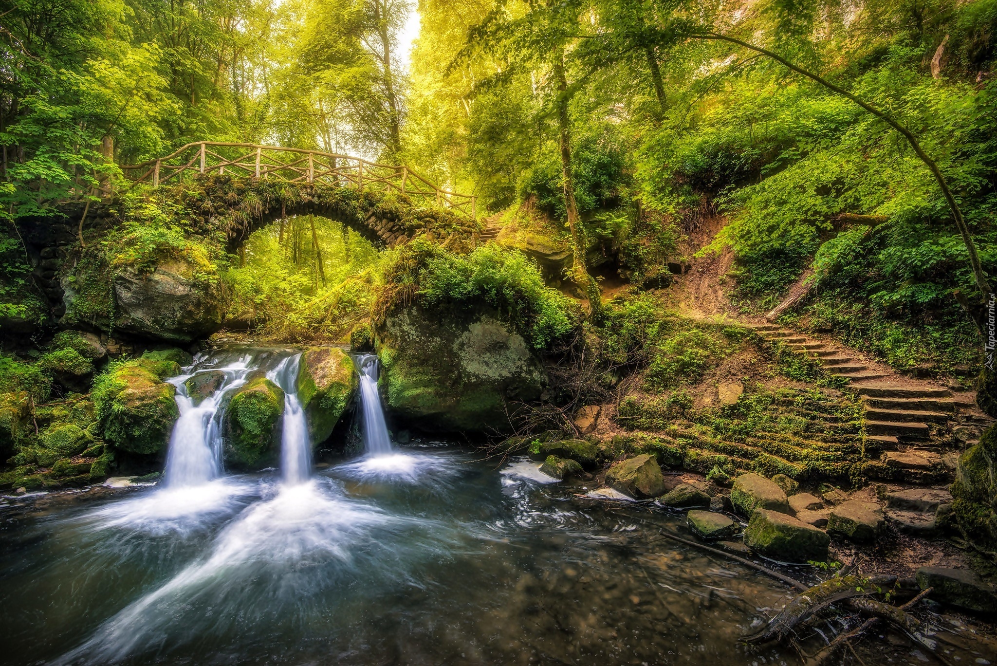 Edytor tapety: Mostek, Wodospad, Las, Schodki