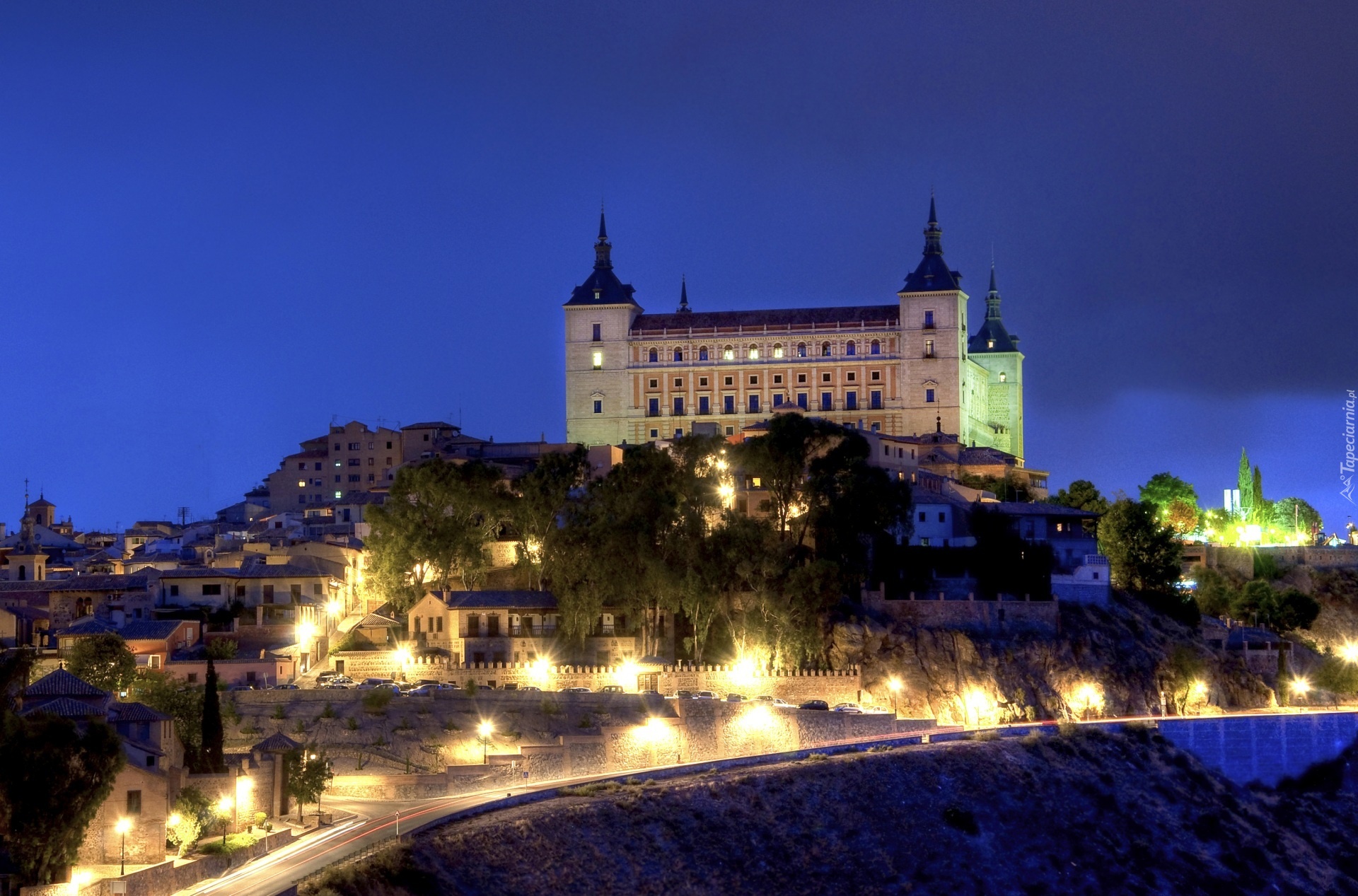 Edytor tapety: Hiszpania, Sewilla, Domy, Noc, Światła, Pałac Królewski Alcazar