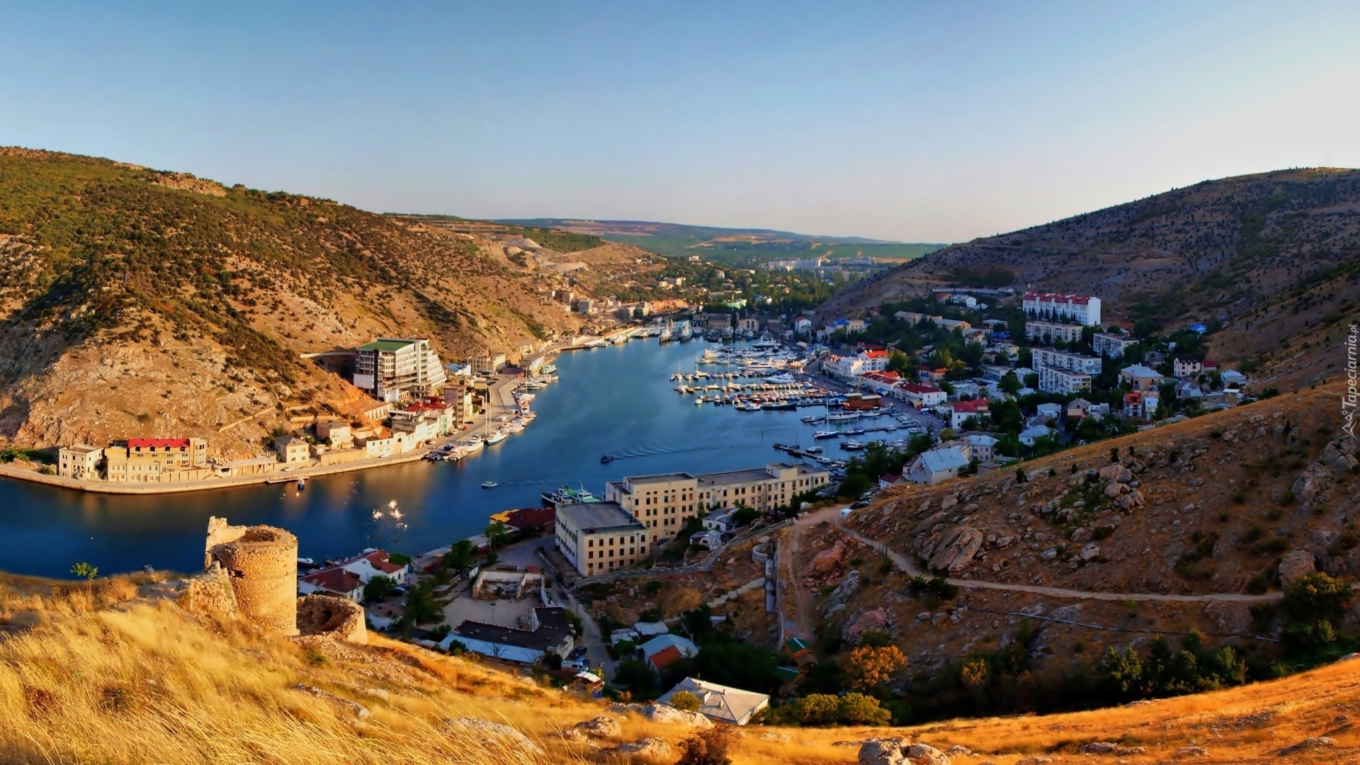 Edytor tapety: Półwysep, Krym, Zatoka, Port, Miasto, Wzgórza