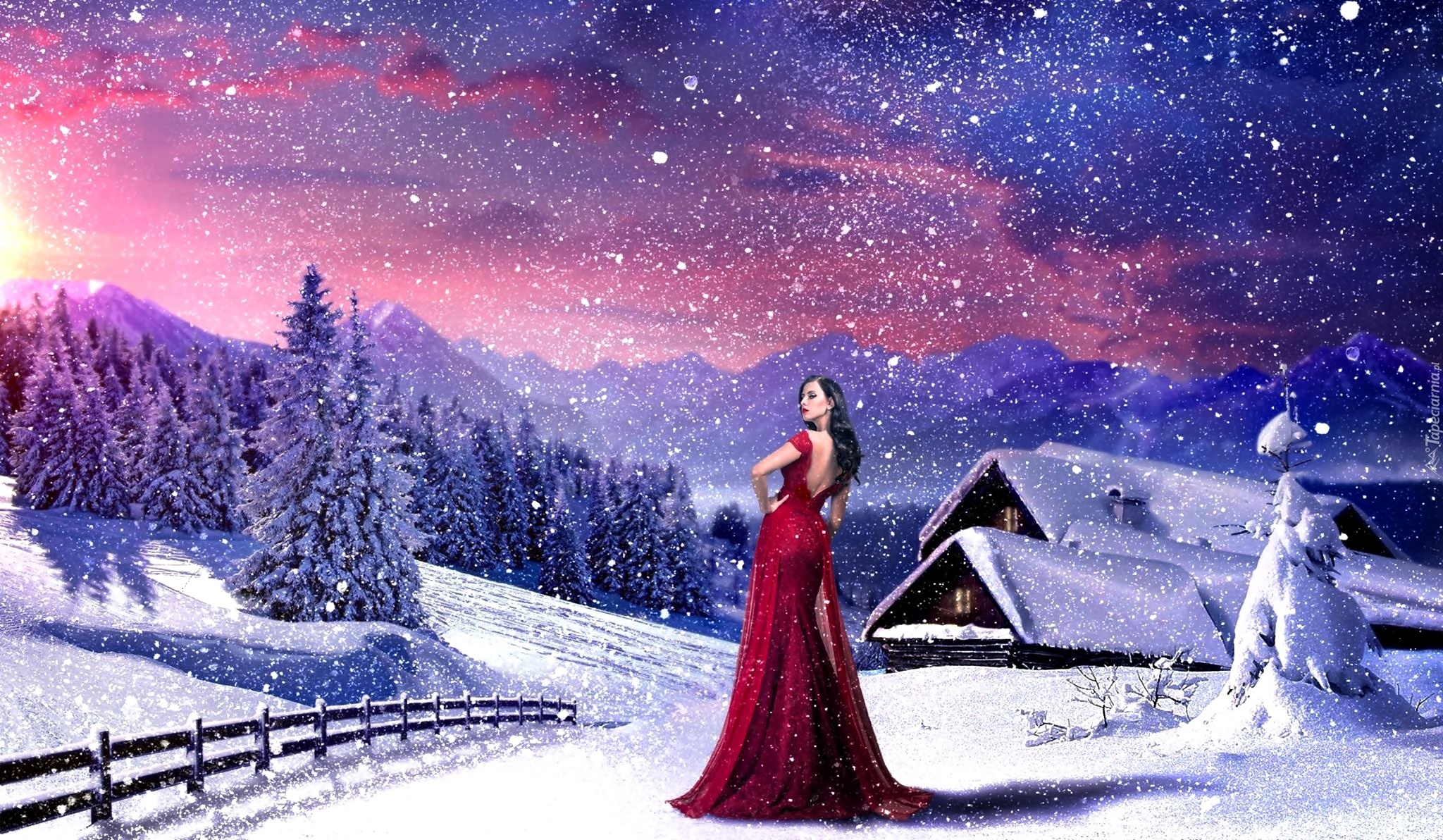 Edytor tapety: Góry, Drzewa, Domki, Kobieta, Czerwona, Suknia, Ogrodzenie, Śnieg