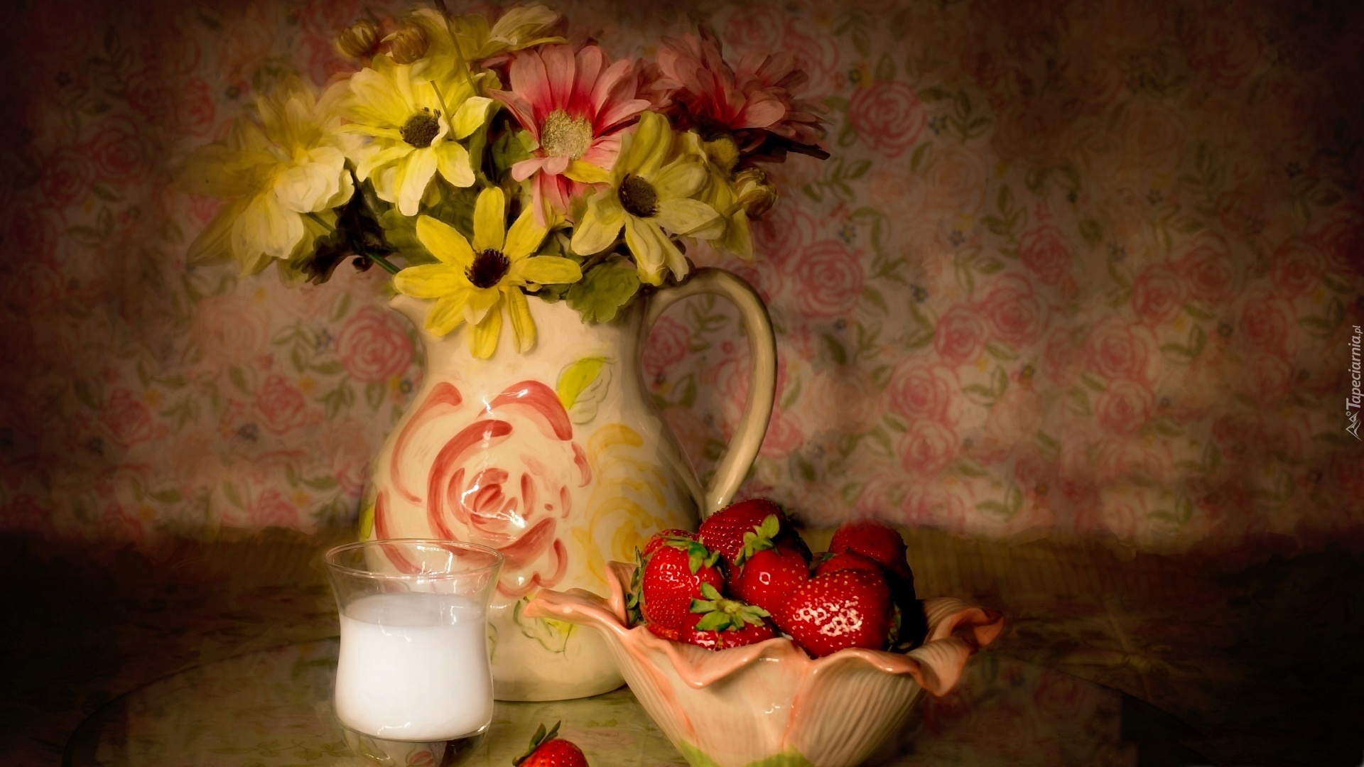 Edytor tapety: Dekoracja, Kompozycja, Truskawki, Bukiet, Kwiaty, Mleko