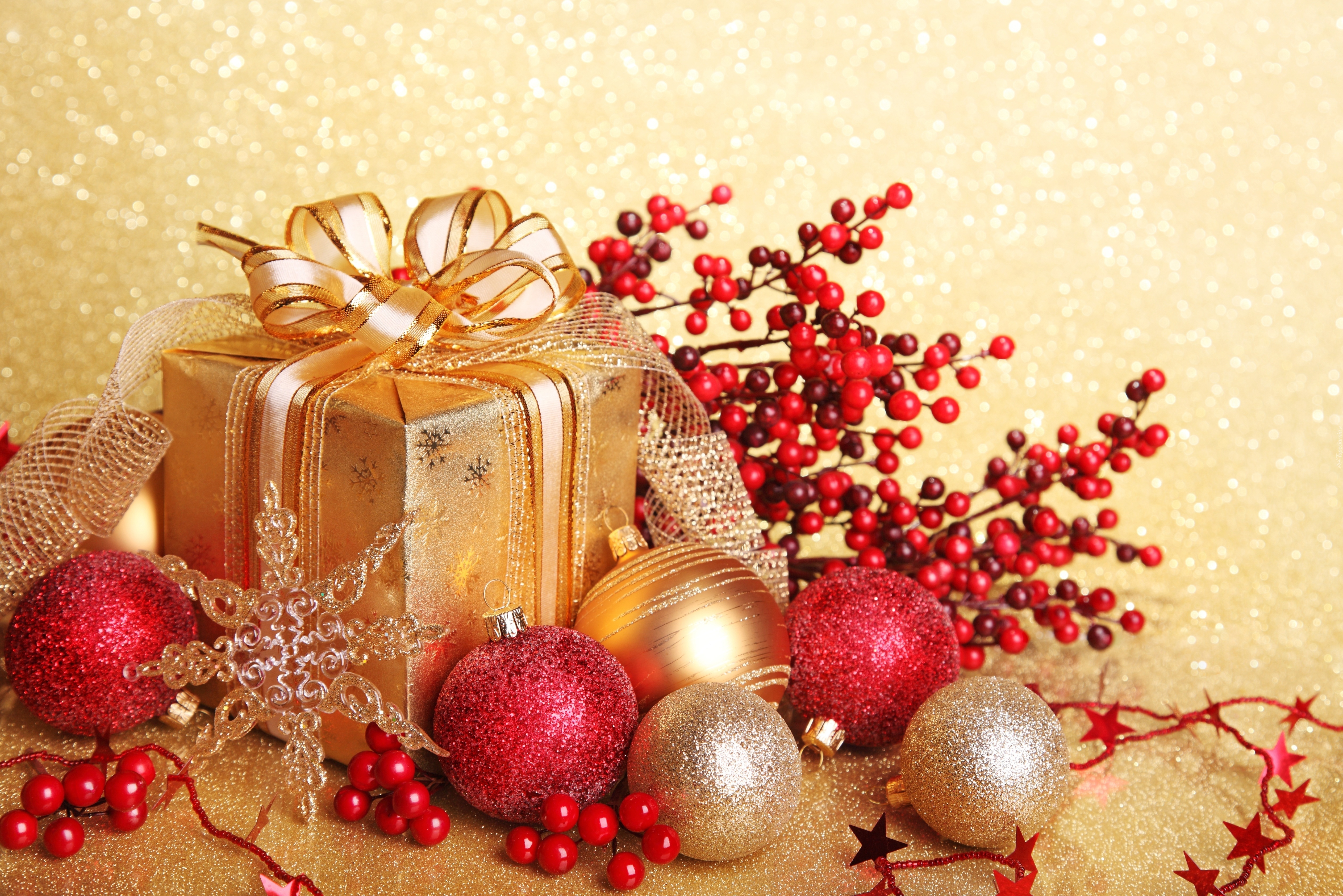 Edytor tapety: Złoto, Czerwona, Dekoracja, Świąteczna, Prezent, Bombki, Gałązki