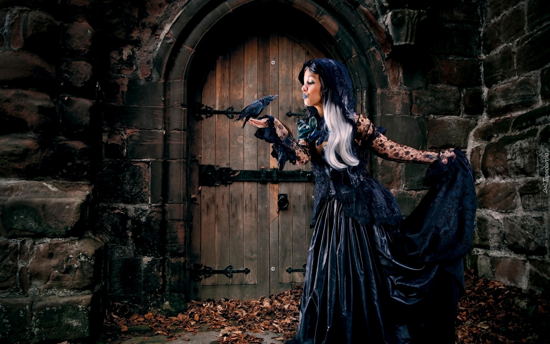 Edytor tapety: Mury,Drzwi, Kobieta ,Czarna, Suknia, Kruk