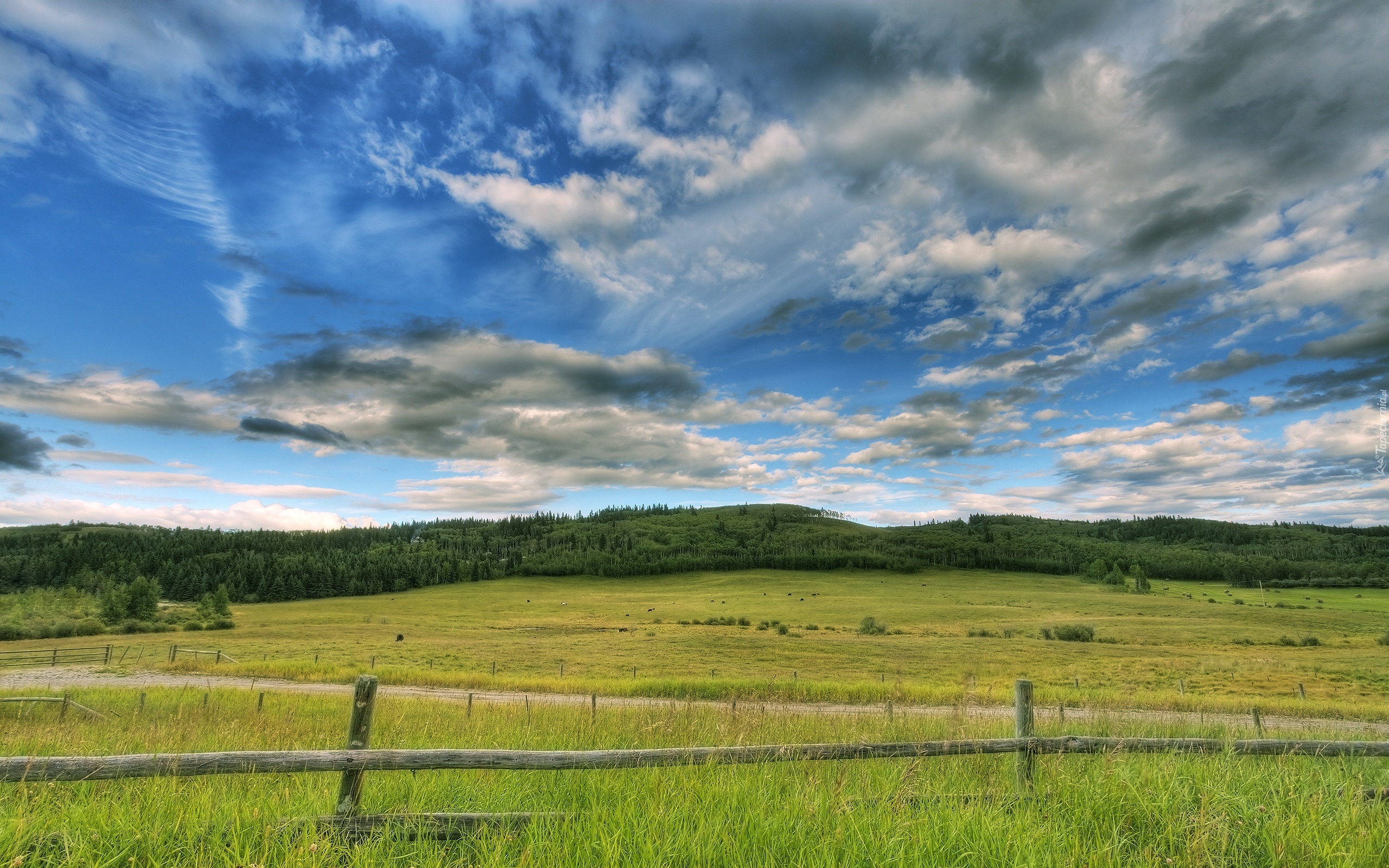 Edytor tapety: Pole, Ogrodzenie, Dróżka, Pochmurne, Niebo, Las
